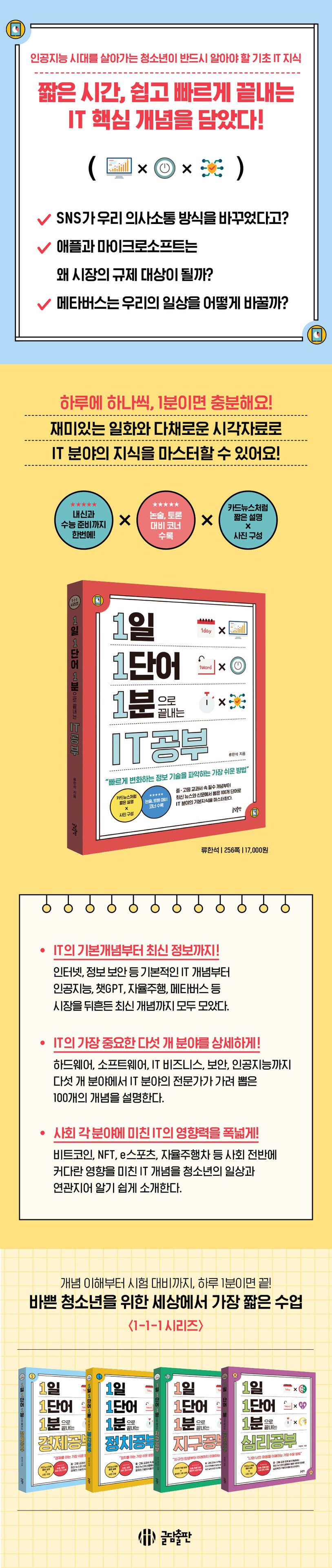 청소년을 위한 짧은 교양 ‘1·1·1 시리즈’의 다섯 번째 책인 〈1일 1단어 1분으로 끝내는 IT공부〉는 휴대폰과 컴퓨터가 생필품이 된 현대 사회에서 반드시 알아야 할 IT 지식을 소개한다. 흔히 IT라고 일컬어지는 정보 기술은 미래를 여는 핵심 기술이며 일상에서 흔히 사용되지만, 정작 관련 지식을 제대로 알고 있는 경우는 많지 않다. 이 책은 스마트 기기의 기본 구성 요소부터 프로그래밍 관련 지식, 비트코인, NFT 등 경제와 연관된 개념, 그리고 메타버스, 챗GTP 등 최신 정보까지 IT 분야의 지식을 두루 살핀다. 다양한 시각 자료가 더해져 내용을 이해하기 쉽고, IT 최신 동향까지 두루 살필 수 있어, 논술과 토론을 위한 상식을 갖추는 데 큰 도움이 될 것이다.
