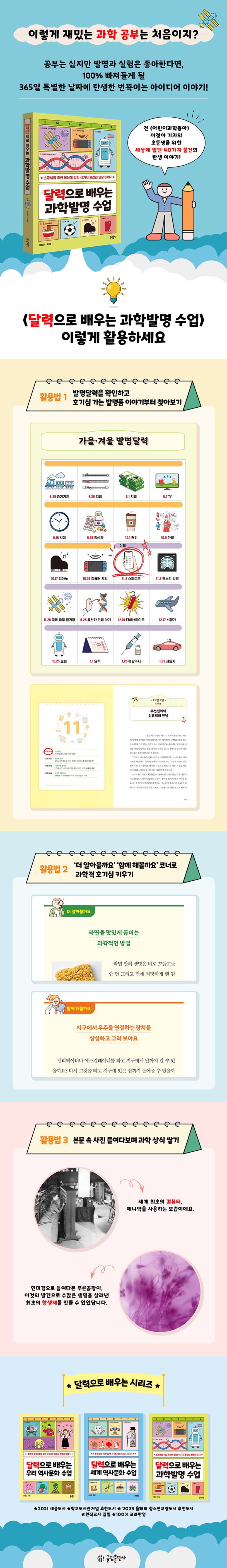 아이들의 눈으로 이 세상을 들여다보면, 궁금하고 신기한 게 너무 많습니다. 이 호기심을 잘 키우고 채워줄수록 아이의 창의력이 반짝이고 지식은 쌓이게 됩니다. 이를 위해 15년간 《어린이과학동아》에서 어린이독자를 위해 과학지식을 전달해 준 이정아 기자가 재미난 과학발명 책을 출간했습니다. 우리가 매일 들여다보는 달력 속에 담겨 있는 재미난 발명 수업에 초대합니다. 130년 전 납으로 만든 팬티를 유행시킨 발명품을 알아보러 유럽으로 날아가기도 하고, 특허청 심사관으로 늘 업무에 시달렸던, 인간미 물씬 풍기는 아이슈타인과 만나기도 합니다. “인류를 파멸할 것”이라고 말한, 조금은 섬뜩한 AI 로봇 소피아를 통해 세계 최초의 로봇을 알아봅니다. 우리 삶에서 이미 필수품이 되어 버린 물건들이 어떻게 탄생했는지, 하나씩 귀 기울이다 보면 재밌어서 빠져들고 저절로 과학공부까지 되는 책입니다. 학교에서 처음으로 과학을 배우기 3학년, 과학이 어려운 고학년, 학습만화에서 벗어나 긴 글 읽기에 도전하려는 어린이, 모두에게 추천합니다. 짧은 분량과 풍부한 사진 자료로 부담 없이 가뿐하게 읽을 수 있는 것도 장점입니다.