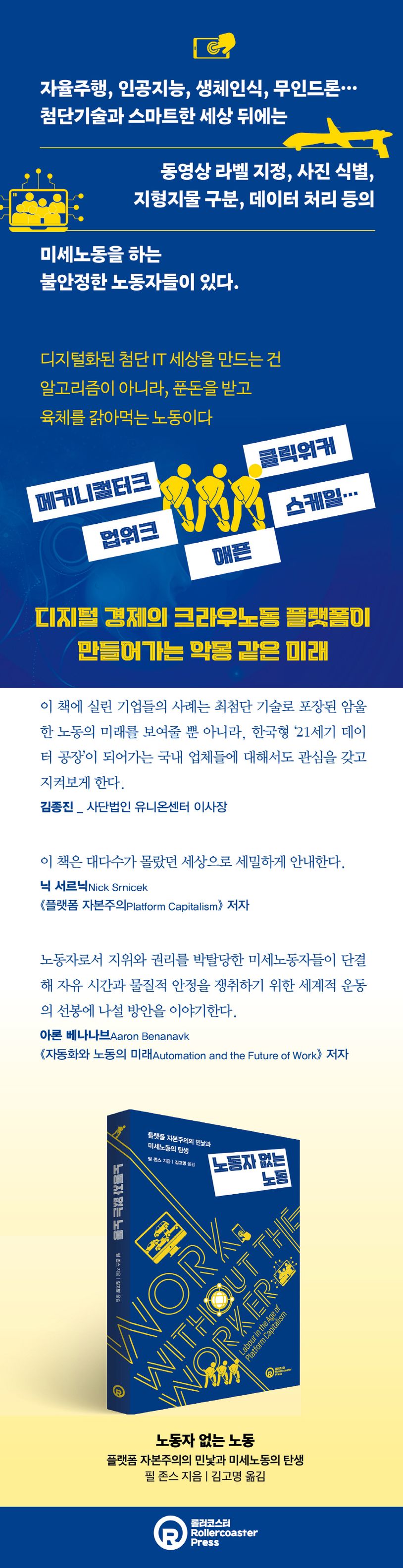 저자는아프리카를비롯해라틴아메리카,중동,아시아같은범남반구에위치한저개발국가들을중심으로,이른바‘클릭경제’가바꿔가고있는오늘날노동과노동자의모습을보여준다.플랫폼을통해불안정한지위에서수행하는단순작업-‘미세노동’에의존하는이들은전세계적으로가파른증가세를보이며약2000만명에이르고있다.미세노동을중개하는사이트덕분에가장큰수혜를입은기업이바로현대자본의총아인아마존,테슬라,페이스북,마이크로소프트,구글,애플등이다.저자는이들기업이어떻게빠른시간에가공할만한방대한데이터를축적해왔는지를추적한다.