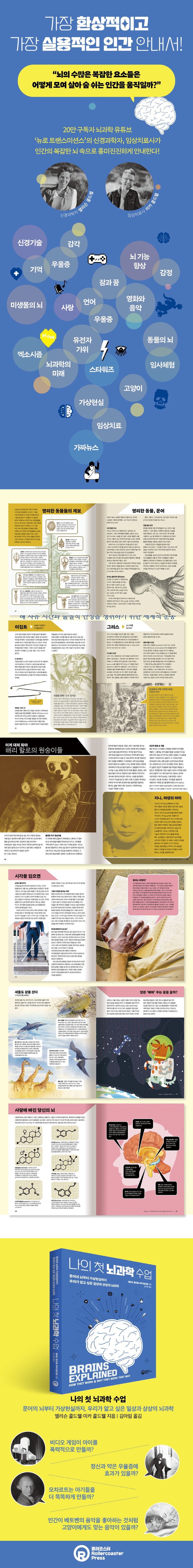 뇌과학을 처음 접하는 독자들을 위해 다양하고 흥미로운 주제와 이미지들로 구성된 이 책은 인류의 먼 과거부터 빛나는 미래까지, 뇌의 앞에서부터 뒤까지 죽 훑어본다. 그리고 시간이 지나면서 뇌가 어떻게 진화했는지, 우리가 뇌에 대해 가졌던 생각이 어떻게 변화했는지 알아본다. 또 정신 질환에 대해 의심쩍었던 의학적 치료법과, 지능을 높이기 위한 미래 지향적인 새로운 치료법들에 대해 살피고, 우리의 고양이가 주인을 정말 사랑하는지, 어째서 우리에게 임상치료사가 필요한지, 각종 ‘두뇌 게임’이 정말로 할 만한 가치가 있는지, 잘 만든 뇌과학 영화는 무엇이 있는지 등 복잡한 뇌를 흥미롭게 이해할 수 있는 많은 이야기와 만날 것이다.