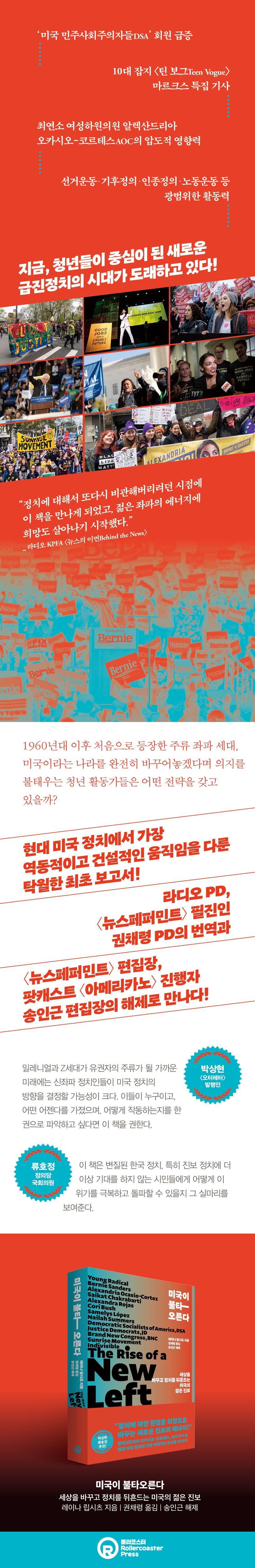 미국 정치 지형에 도도한 변화의 바람이 불고 있다. 레드 콤플렉스라는 수면 아래 가라앉아 있던 좌파 세력이 꿈틀대기 시작했다. 2018년 선거에서 AOC가 깜짝승리를 거두며 일약 스타덤에 오르고, 2016년과 2020년 대선에서 버니 샌더스가 예상 밖 돌풍을 일으킨 현상은 ‘뉴레프트New Left'라 불리며 사회 곳곳에서 새로운 변화의 길로 힘차게 걸어가는 사람들이 지역사회에 뿌리를 두고 시대적 요구에 귀 기울인 결과로, 이미 예견된 일이었다.
