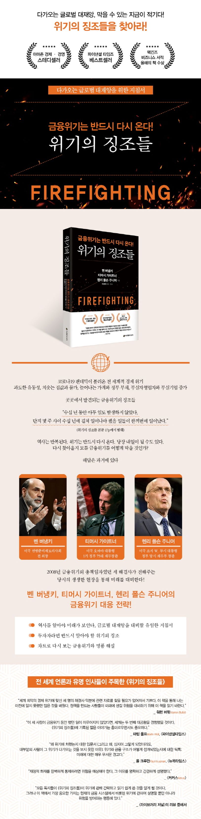 2008년 금융위기 당시 총책임자였던 벤 버냉키와 티머시 가이트너, 헨리 폴슨 주니어는 10여 년이 지난 지금, 세계 최악의 금융위기에 맞섰던 생생한 그 현장의 이야기를 《위기의 징조들》에 담았다. 함께 금융위기를 해결하며 그 지침을 마련하는 데 바탕이 된 이론과 이를 실행한 과정에 관해 통합적이면서도 통찰력 있는 시각으로 당시 금융위기를 바라보면서 해법을 제시하고 있다. 이제 우리는 그들이 어떤 방법으로 위기에 대응했는지 그 방법을 익혀서 다가올 미래에 대비해야 한다. 자본주의 금융 시스템은 결코 완벽하지 않다. 반드시 위기는 다시 온다. 이 책을 통해 위기의 징조들을 찾아내 보자!