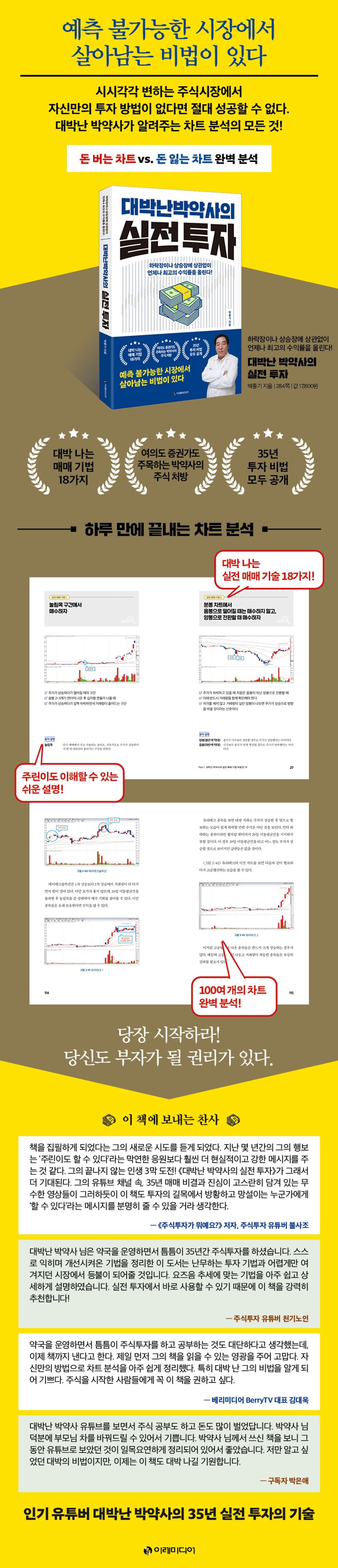 충남에서 약국을 운영하는 약사이자 약 12만 명 구독자의 유명한 인기 유튜버인 대박난 박약사가 35년 동안 주식투자를 하며 자신만의 실전 투자의 기술을 일목요연하게 정리한 《대박난 박약사의 실전 투자》를 펴냈다. 대박난 박약사만의 실패하지 않는 투자의 기술과 대박 나는 매매 비법 18가지를 이 책 한 권에 모두 정리했다.