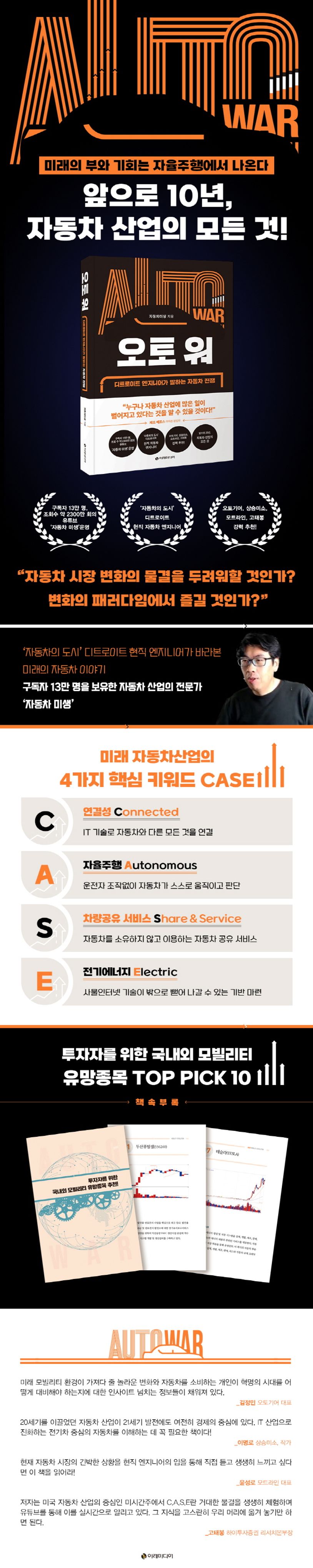 『오토 워』는 전기자동차와 자율주행으로 대변되는 모빌리티 세상의 과거, 현재, 미래를 현실적으로 바라보게 하는 책이다. 그 배경에는 ‘자동차의 도시’ 디트로이트에서 엔지니어로 일하며 몸소 변화를 체감하는 저자의 경험이 깔려 있다. 20년 전 무모하게 감행한 미국행은 결과적으로 저자에게 브레이크, 스티어링, 서스펜션, 로봇 등을 두루두루 접할 수 있는 기회를 가져다주었다. 또한 테슬라의 등장 이후로 급박하게 돌아가는 미국 자동차 산업의 모습을 직시하게 해주었다.