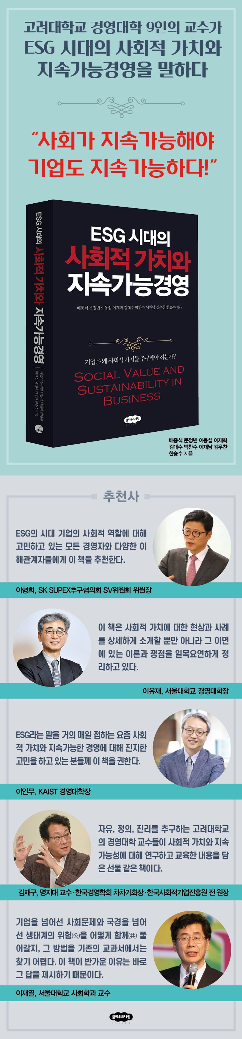 이 책은 고려대학교 경영대학 교수 9인이 경영학 전체와 각 전공을 대표하여 경영(학)에서의 사회적 가치와 지속가능경영에 대해 그동안의 논의를 정리하고 앞으로의 방향을 모색하고 있다. 사회적 가치를 포함한 ESG의 이념과 이론적 배경, 분석틀은 무엇이며 그 성격 규정 방법, 사회적 가치의 철학적 기반, 사회적 가치 측정 방법, 경영학 세부 분야들인 경영관리, 국제경영, 생산, 마케팅, 경영정보시스템MIS, 재무, 회계에서는 사회적 가치에 관해 어떤 연구들이 있었고 기업의 사례들은 무엇인지 소개하고 사회적 가치의 미래 전망은 무엇인지를 예상한다. 국내에서 사회적 가치에 관한 한 가장 최전선의 연구와 사례를 담고 있다.