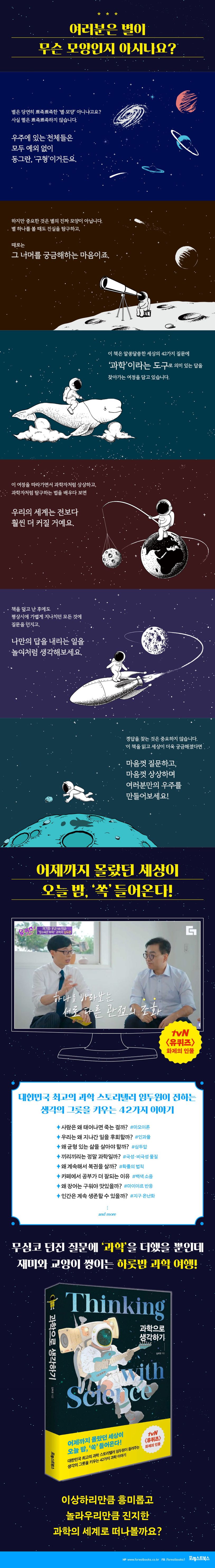 『과학으로 생각하기』의 저자 임두원은 국립과천과학원의 연구원으로 TV 프로그램 〈유퀴즈 온 더 블록〉 ‘문과vs이과’ 특집에서 “눈이 녹으면?”이라는 질문에 “(당연히) 물이 되죠”라고 답하는 이과형 인간의 대표주자로 출연해, 탕수육은 과학적으로 부먹이 맞다고 주장하며 ‘부먹 vs. 찍먹’ 논쟁을 종결시킨 화제의 인물이다. 과학적 논리를 일상의 호기심과 연결해 무한한 이야깃거리를 만들어내는, 타고난 스토리텔러인 그는 이 책을 통해 “끼리끼리는 정말 과학인가요?”처럼 엉뚱한 질문부터, “눈은 왜 3개가 아니라 2개인가요?”처럼 익숙한 일상에 딴지를 거는 질문, “영원한 삶은 축복일까요?”, “사람은 왜 겸손해야 하나요?” 등 일상의 태도를 넘어 인생을 고찰하는 철학적 질문까지 총 42가지 궁금증을 탁월한 입담으로 풀어가며 과학의 본질에 한층 다가갈 수 있도록 돕는다.