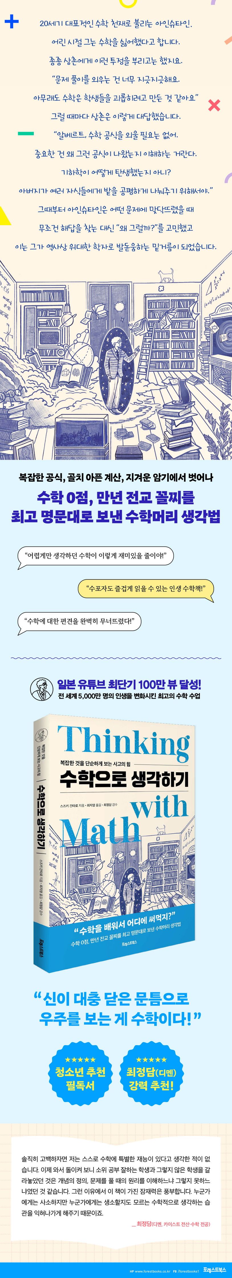 이 책 『수학으로 생각하기』는 수학을 딱딱하고 어렵고 골치 아픈 학문이라고만 생각해왔던 사람들에게 색다른 즐거움을 선물한다. 복잡한 것을 단순하게, 모호한 것을 명쾌하게, 평범한 것을 특별하게 변화시키는 경험 말이다. 수학 점수를 잘 받고 싶은 사람이라면 과감히 이 책을 덮어라. 하지만 남들보다 쉽고, 명쾌하고, 분명한 답을 찾고 이를 통해 한 단계 성장할 수 있는 사고력을 기르고 싶다면 단언컨대 이 책은 당신에게 최고의 안내서가 되어줄 것이다.