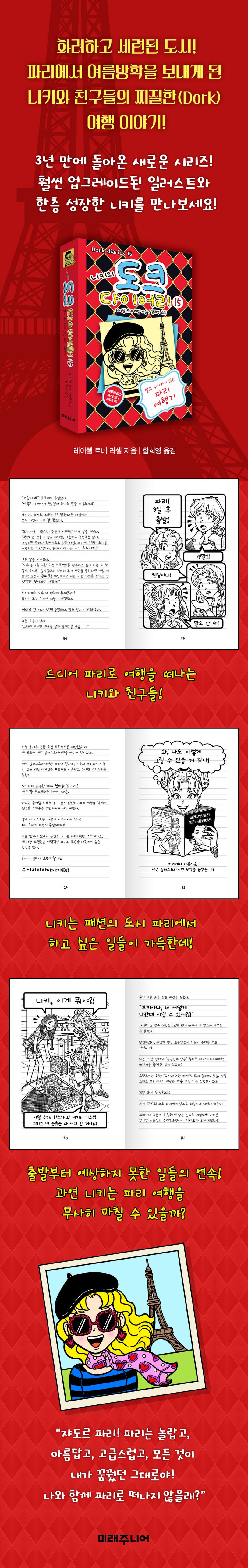 초절정 인기 그룹 ‘배드 보이즈’와의 일정이 생각보다 빨리 마무리되며 니키와 친구들은 조금은 지루한 여름방학을 보내게 된다. 그러다가 동네에서 열리는 작은 축제의 오프닝 무대에 서지만, 노래를 부르다 크게 넘어지며 커튼을 뒤집어쓰는 대참사를 겪게 되는데……. 매회 시작부터 사건 사고의 연속으로 웃음과 감동 그리고 쫄깃함을 선사하는 《니키의 도크 다이어리》가 드디어 15편을 출간했다. 특히 이번 15편에서는 니키와 친구들이 예전부터 고대했던 파리로 여행을 떠난다. 그뿐만 아니라 파리의 유명한 잡지 표지 촬영을 할 기회도 함께 얻었다. 하지만 옷이 통째로 사라져 버리거나 생각지도 못한 브랜든의 라이벌 앙드레가 등장하는 등, 끊임없이 사건 사고가 일어난다. 그래도 니키 특유의 유쾌함과 친구들의 도움으로 난관을 멋지게 헤쳐 나가며 진정한 파리 여행을 즐기기 시작한다. 저자는 니키가 파리 곳곳을 여행하며 직접 스케치한 이미지를 실었고, 관광지를 돌며 보고 느낀 점과 여행 팁까지 상세하게 표현하며 독자들이 마치 니키와 함께 파리를 돌아보며 여행하는 기분을 체험하게 구성했다.