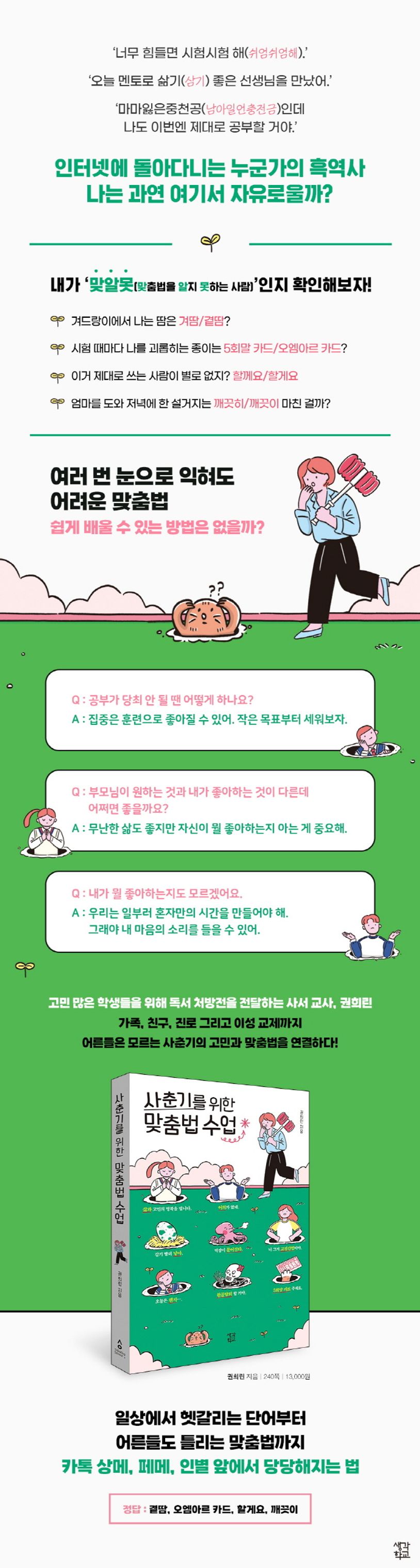 좋아하는 친구를 위해 멋진 근육을 만들고, 다이어트를 하지만 맞춤법을 틀리면 후광을 잃게 된다. 이 책은 SNS에서 흑역사를 생성하고 싶지 않은 청소년들의 마음을 짚으며 디지털 세대에게 중요하다는 문해력의 기본인 맞춤법을 익히게 돕는다. 이 책을 통해 청소년들은 맞춤법이야말로 친구들과의 소통을 돕는 중요한 핵심임을 알게 될 것이다.