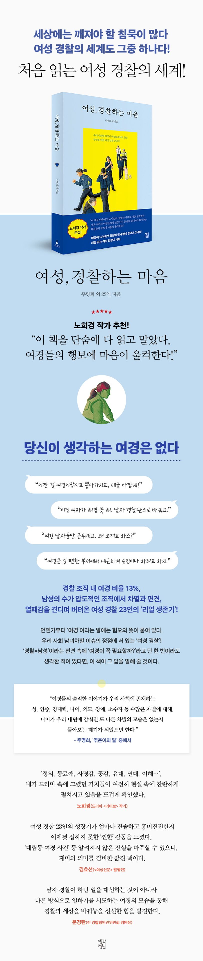이 책은 여성 경찰 23인, 31편의 글을 모았다. 남성 경찰의 수가 압도적인 조직에서 여경은 어떤 모습으로 존재하는지, 생생한 현장의 이야기를 담고 있다. ‘경찰=남성’이라는 사회적 인식과 그로 인한 차별과 불평등을 알면서도 그녀들은 왜 굳이 힘들고 위험한 경찰 세계에 뛰어들었는지, 무엇이 그녀들의 가슴을 정의와 사명감으로 타오르게 했으며, 어떻게 조직 안팎의 편견과 차별을 견디며 버텨왔는지를 기록한 ‘여경 분투기’이다. 약자에 대한 연민과 남다른 정의감을 외면하지 못하는 뜨거운 마음 때문에 경찰이 될 수밖에 없었던 그녀들의 고뇌와 활약상은 여경, 남경 논쟁에서 벗어나 진정한 경찰이란 무엇인지 되묻게 한다. 나아가 진짜 경찰을 만드는 제도와 시스템을 갖추는 게 더 시급하다는 본질적 진단을 이끌어낸다.