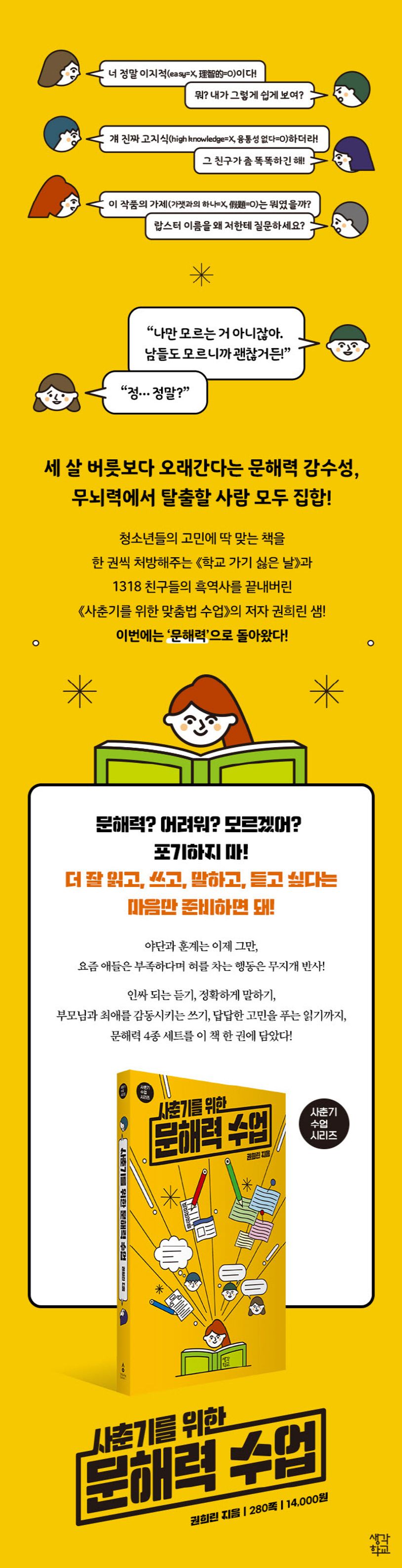 이 책은 그간 읽기와 쓰기에 집중된 문해력의 범위를 넓혀 말하기, 듣기까지 포함해 문해력의 A to Z를 담았다. 문해력 4종 세트(듣기, 말하기, 쓰기, 읽기)에 대해 딱딱하게 접근하는 대신, 학생들의 눈높이에 맞춰 인싸 되는 듣기, 정확하게 말하기, 부모님과 최애를 감동시키는 쓰기, 답답한 고민을 푸는 읽기로 풀어내어 문해력을 향상시킬 수 있는 방법을 알려준다.