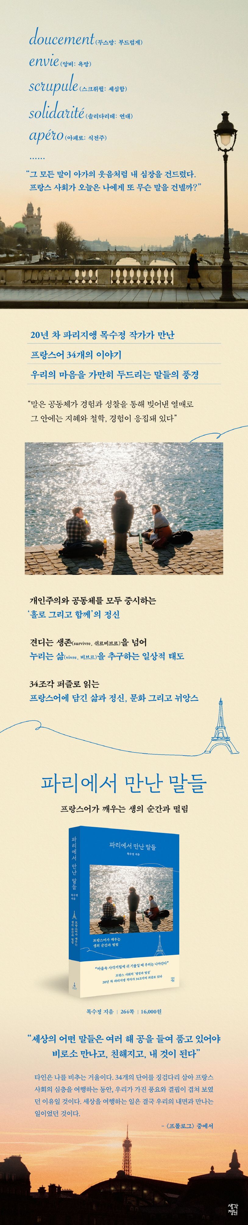 20년간파리지앵으로살며한국과프랑스의경계에서글을써온목수정작가.그간《칼리의프랑스학교이야기》《아무도무릎꿇지않은밤》《파리의생활좌파들》등에서프랑스사회의속깊은이야기를들려주었다.그가세밀하게묘사한,자유·평등·박애의가치에닻을내리고한국과다른논리로굴러가는프랑스사회와일상은거울처럼우리삶을돌아보게하고,우리가나아갈길을제시해왔다.그랬던그가이번에는자신의마음을가만히두드렸던프랑스어34개의이야기를담은에세이집《파리에서만난말들》로독자곁에찾아왔다.작가는왜‘말’에주목했을까?그는“말은각각의공동체가경험과성찰을통해빚어낸열매”로,그씨속에는공동체의응집된지혜와경험,철학이담겨있다고말한다.일상을풍요롭게살아가게하는태도부터‘혁명의나라’를이끌어온끈끈한공동체정신까지,프랑스어34개가펼치는‘말들의풍경’을통해프랑스의심층을들여다보는것이다.