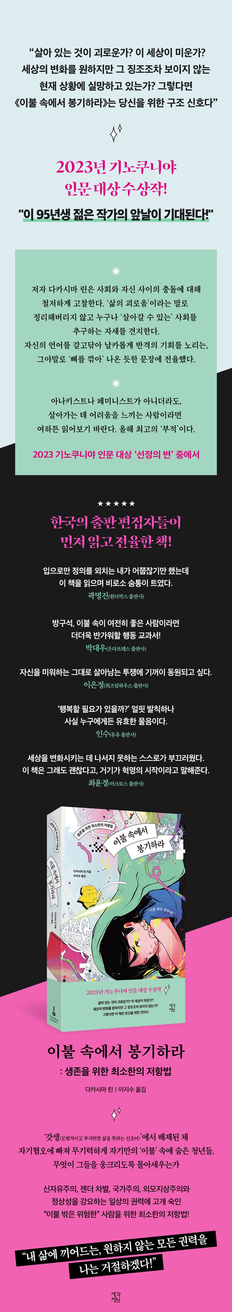 1995년생 신예 작가 다카시마 린은 ‘이불 속에서도 가능한’ 혁명을 주장한다. 이불 속에 웅크리고 있어도 그저 ‘생존’함으로써 잘못된 사회에 저항할 수 있다는 것이다. 저자는 혐오, 차별, 불평등, 가난 등 사회문제가 어떻게 개인의 문제로 바꿔치기 되는지를 예리한 언어로 드러내면서, 좌절감으로 자기 비하에 빠진 이들에게 ‘목을 감싼 손을 풀고, 사회를 향해 주먹을 고쳐 쥐자’고 격려한다. 그는 이불 속에서 자기 생각을 차근차근 정리하는 것만으로 저항을 시작할 수 있는 단초가 될 수 있다고 하며, 가장 소외되고 배제된 약자까지 참여할 수 있는 혁명이 진정한 혁명이라 역설한다. 이를 위해 이불 속에 웅크린 모두를 향한 위로와 응원을 글로 담아 함께 저항에 나설 것을 촉구하고 있다. 저자의 주장은 일본에서 큰 화제를 불러왔고, 일본의 대표 서점 기노쿠니야는 ‘2023년 최고의 인문서’로 《이불 속에서 봉기하라》를 선정하며 ‘기노쿠니야 인문 대상’을 수여했다.