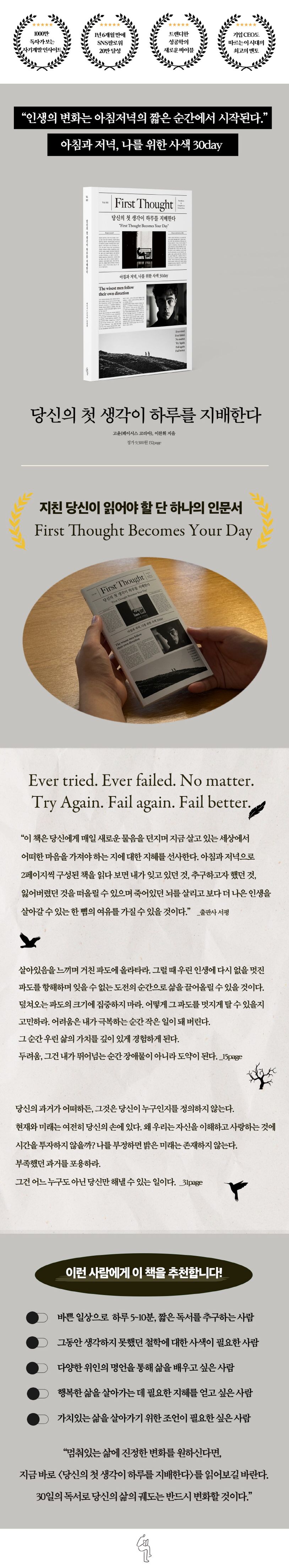 “어제보다더나은오늘을위한30일의독서”가벼운자기계발의시작<당신의첫생각이하루를지배한다>우선,당신에게이렇게물어보고싶다.“아침저녁으로어떤생각을하시며지내나요?”우리는자신의부족함과결점만바라보고더나은내일을꿈꾸지않고있다.나보다잘난사람과초라한나를비교하며스스로포기를자처하는것이다.이런사람들에게는단순한동기부여가아닌,근본적인것을해결할수있는‘생각할시간’이필요하다.아침과저녁.졸린눈을비비고일어나일터로향하고,다시침대에몸을던지는순간까지우리는공평하게24시간을활용하며인생을살고있다.매일똑같은시간을보내지만,누군가는긍정적이고활력이넘치며누군가는부정적이고나태하니여기서삶의격차는벌어지기마련이다.책<당신의첫생각이하루를지배한다>는당신에게매일새로운물음을던지며지금살고있는세상에서어떠한마음을가져야하는지에대한지혜를선사한다.아침과저녁으로2페이지씩구성된책을읽다보면내가잊고있던것,추구하고자했던것,잃어버렸던것을떠올릴수있으며죽어있던뇌를살리고보다더나은인생을살아갈수있는한뼘의여유를가질수있을것이다.저자는이책에서자기계발에대한방법을논하는것보단‘가능성’을일깨워주며수많은사례를통해성장의발판을제공한다.만약무겁고진부한자기계발에지쳤다면아침저녁으로사색할수있는이책을읽어보길바란다.당신이짧게하는5분의독서가인생을바꿀지는아무도모른다.책속에서1.우리는슬픔을받아들이고스스로에게울음과눈물을허락해야한다.슬픔과아픔을느끼는것은본질적으로자연스럽고인간적인경험이다.우리는우리의감정을무시하거나부정하려는시도를하는대신,슬픔을받아들이고울음을허락하며스스로를위로해야한다.이것은내가겪는감정을충분히느끼고이해한다는자신을향한위로의메시지이며스스로를치유하고성장할수있는능력을갖게된다.그러니깊은고통이닥쳤을때,그슬픔을느끼고그것을울음으로표현하라.눈물을통해흘려보내라.지나간눈물에힘든상황과어려운마음을담아라.이것이결국우리의감정을건강하게유지하는방법이며,우리가인생의어려움에이기는방법이다.2.인생이흘러가는것이아닌인생을‘산다’는것은바쁜하루속에서도자신의영혼을챙겨가는일이다.바쁘게일상을보내고있다하더라도중요한무언가를놓치고있진않은지,나의영혼이나를잘따라오고있는지,딱5분의시간을내어나를돌아보는시간을가져보면어떨까.현대인으로살아가지만우리는때때로인디언이되어야한다.삶의흐름속에서영혼이나와함께하고있는지확인하고,그영혼이가리키는방향을향해몸을이끌어주자.온전한인생을산다는것은결국나자신을사랑하고존중하는길과맞닿아있다.지금나의영혼은어느방향을향해손가락을가리키고있는가,그리고무어라말하고있는가.잠시귀기울여보자.3.살아있음을느끼며거친파도에올라타라.그럴때우린인생에다시없을멋진파도를항해하며잊을수없는도전의순간으로삶을끌어올릴수있을것이다.덮쳐오는파도의크기에집중하지마라.어떻게그파도를멋지게탈수있을지고민하라.어려움은내가극복하는순간작은일이돼버린다.그순간우린삶의가치를깊이있게경험하게된다.두려움,그건내가뛰어넘는순간두려움이아니다.4.천재를떠올리며우리가마땅히집중해야하는것은‘재능’이아니라‘노력’이다.우린어쩌면그들이가진재능뿐만아니라노력또한따라가지못하고있는게아닌지스스로질문해야한다.모차르트는한번작곡을시작하면일주일넘게방안에서나오지않았고,폰노이만또한한번문제를맞닥뜨리면해결할때까지자리에서일어나지않았다.주어진삶에마땅히노력하지않는사람이될것인가,아니면주어진재능에천재들의노력을보태어천재의반열에들것인가?5.모든것을내려두고눈을감은채3초동안숨을들이켜보자.그리고다시눈을뜨고사랑하는사람을떠올려보자.그사람이가장바라는것은무엇인가,그사람에게가장적합한사랑은어떻게표현해주어야할까?우리는이질문에직면함으로써,자신의욕망을잠시내려두고진짜사랑을실천할수있다.6.자신에게솔직한사람은자신의부족함을인정하고,그부족함을극복하려는큰용기를가진사람이다.그리고이모든것을실천하는사람이바로당신이다.오늘아침에도당신은목표를향해발걸음을떼었다.이건곧,더나은나를향한진보이며,이과정에서우리는나를더알아가고,성장하게된다.오늘아침,당신의성장에찬사를보낸다.7.스스로를통제할수있을거라는잘못된믿음이오늘도당신을실패로인도한다면,그것은반드시바꿔야할행동이다.유혹에빠지지않는사람은지혜롭다고말할수있다.그리고유혹에빠지지않는삶은곧성장하는삶을의미한다.당신은어떤삶을선택할것인가?단한번의선택이삶의궤도를바꿀수있다.그대를유혹하는것을철저하게배제하는일이필요하다.8.당신의과거가어떠하든,그것은당신이누구인지를정의하지않는다.현재와미래는여전히당신의손에있다.왜우리는자신을이해하고사랑하는것에시간을투자하지않을까?나를부정하면밝은미래는존재하지않는다.부족했던과거를포용하라.그건어느누구도아닌당신만해낼수있는일이다.---본문중에서