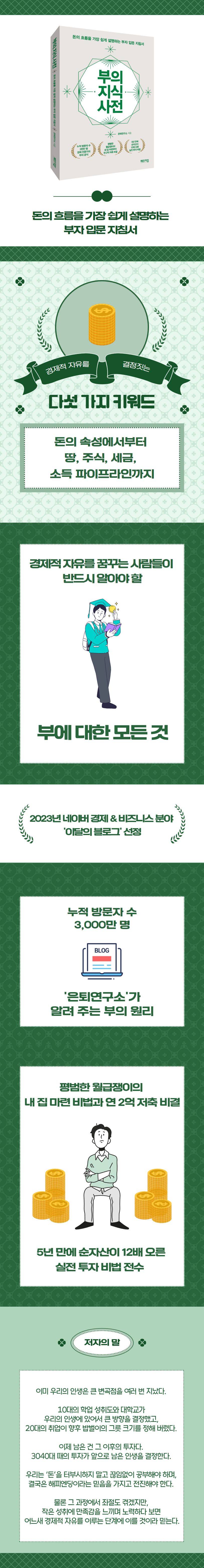 글로벌 금융 위기 이후 전 세계적으로 ‘파이어족’이 크게 주목받고 있다. 조기에 경제적 자유를 달성한 후 은퇴함으로써 일상의 경쟁에서 벗어나 편안한 삶을 추구하고자 하는 파이어족의 등장은 젊은 세대의 새로운 라이프 스타일로 자리 잡았으며, 부에 대한 사람들의 생각과 가치관을 바꾸고 있다. 이들은 근로 소득만으로는 절대로 부자가 될 수 없다는 것을 알고 있으며, 자본 소득과 소득 파이프라인을 구축해야 한다는 것을 잘 알고 있다. 이들은 더 이상 이전 세대처럼 돈을 터부시하거나 부에 대한 열망을 천박하게 생각하지 않으며, 돈에 대해 끊임없이 공부하여 자산을 늘리고, 나아가 경제적 자유를 이루고픈 열망을 당당하게 이야기한다. 이 책의 저자는 대표적인 파이어족으로서 경제적 자유를 꿈꾸며 누구보다 치열하게 살고 있다. 그가 운영하는 블로그 ‘은퇴연구소’는 하루 방문자 수가 2만 명, 누적 방문자 수가 3천만 명에 달하며, 2023년 네이버 경제 & 비즈니스 분야 ‘이달의 블로그’로 선정되기도 했다. 주위에서 흔히 볼 수 있는 평범한 직장인이지만 남들보다 일찍 ‘돈’에 대해 깨달았고, ‘돈’으로부터 자유로워지기 위해 누구보다 열심히 공부하고 일하며 살고 있다. 그 덕분에 공릉동 구축 빌라에서 전세 대출로 신혼 생활을 시작하여 5년 만에 자산 8배, 순자산 12배를 만들었고, 결혼 7년 차인 현재 연 2억 원을 저축하며 경제적 자유를 향해 나아가고 있다. 저자는 부를 얻기 위해서는 무엇보다 먼저 ‘돈’과 ‘돈의 흐름’에 대해 알아야 한다고 강조한다. 이 책은 경제적 자유를 결정짓는 다섯 가지 키워드인 돈의 속성에서부터 땅, 주식, 세금, 파이프라인까지 부의 원리와 공식을 설명하며, 경제적 자유를 꿈꾸는 사람들이 반드시 알아야 할 부에 대한 모든 것을 다루고 있다. 이 책을 통해 독자들은 ‘돈이란 무엇인지’, 그리고 ‘경제적 자유를 이룬 사람들은 어떻게 부를 축적했는지’ 그 메커니즘에 대해 이해할 수 있으며, 진정한 경제적 자유를 꿈꿀 수 있게 될 것이다.