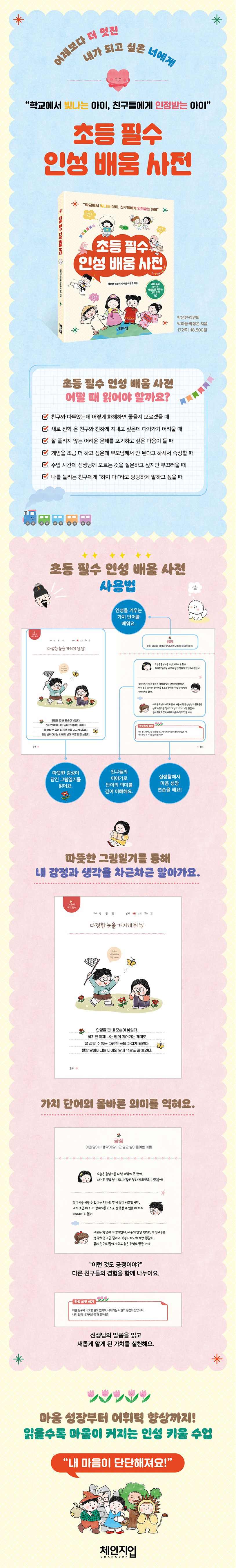 『초등 필수 인성 배움 사전』은 초등학생이 반드시 알아야 할 인성 덕목을 소개한 책입니다. 성실, 존중, 배려, 책임, 정직, 용기, 예의, 포용 등 한국교육개발원의 〈학생 인성 검사〉 항목을 기반으로 구성한 70가지 덕목을 담았습니다. 감정 조절 능력과 사회성을 키우는 70개의 가치 단어를 소개하고, 학교와 가정에서 각 덕목을 실천할 수 있는 구체적인 사례를 함께 보여 줍니다. 친구들의 그림일기와 이야기를 통해 덕목의 의미를 이해하고 실천하며, 나를 사랑하는 방법, 친구와 사이좋게 지내는 방법, 밝은 세상을 만들어 가는 방법을 배울 수 있습니다.
