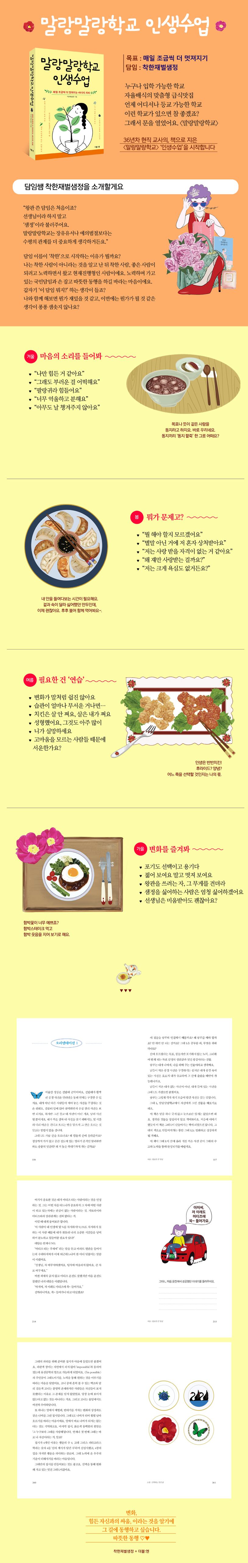 책 《말랑말랑학교 인생수업》은 ‘나’를 발견하고 표현하는 것에서 시작하여(마음의 소리를 들어봐 + 뭐가 문제고?) 연습을 통한 변화, 성장, 선택할 줄 아는 삶, 파티를 즐기는 삶으로 이어진다. 겨울에서 봄으로 이어지는 사계절로 구성했으며, 먹는 것에 진심인 담임쌤 덕분에 중간중간 급식시간도 있다.