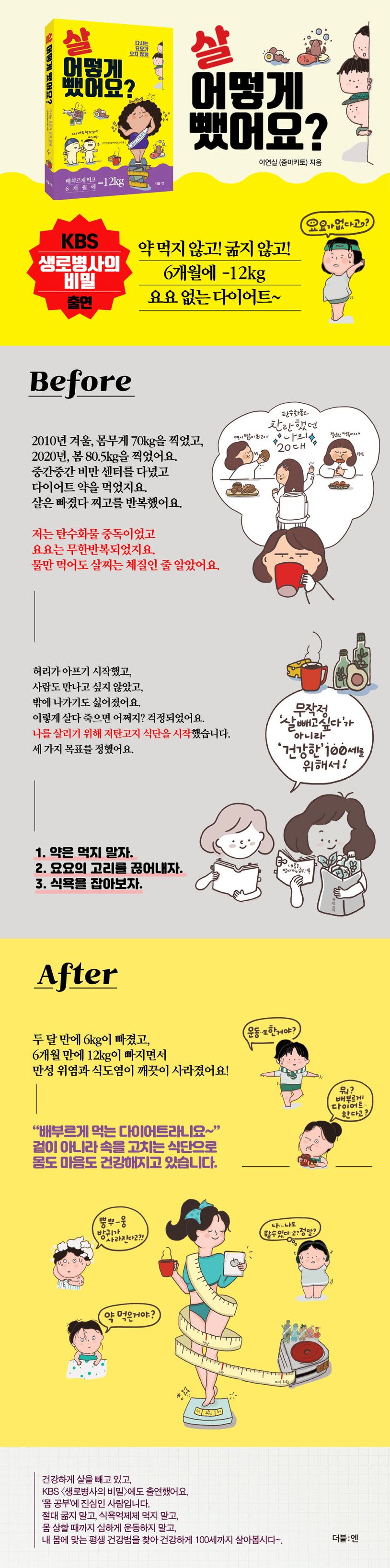 서서히 늘어가던 몸무게가 80kg을 돌파하던 순간, 이렇게 살다 죽을 수도 있겠다 싶은 절박함이 가득하던 순간, 온갖 다이어트에 실패한 경험을 뒤로하고 ‘운동 없이 요요 없는 다이어트가 가능하다’는 저탄고지 식단을 시작한 저자의 18kg 감량 스토리를 담았다.