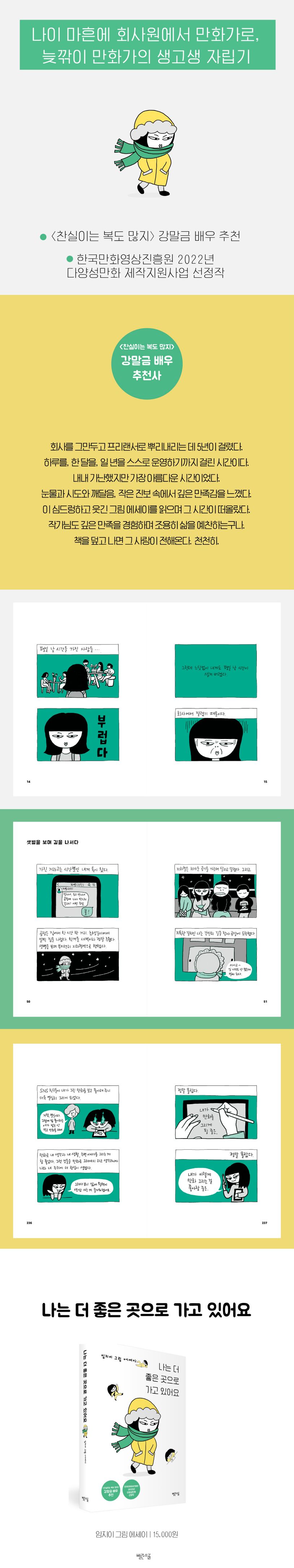 그러니까 그 과정을 담은 《나는 더 좋은 곳으로 가고 있어요》는 결코 이르다고 할 수 없는 나이 마흔에 지금까지 하던 일과 완전히 다른 일을 시작한 사람의 이야기이자, 자기 시간의 주인으로 살아가고자 하는 사람의 이야기다.