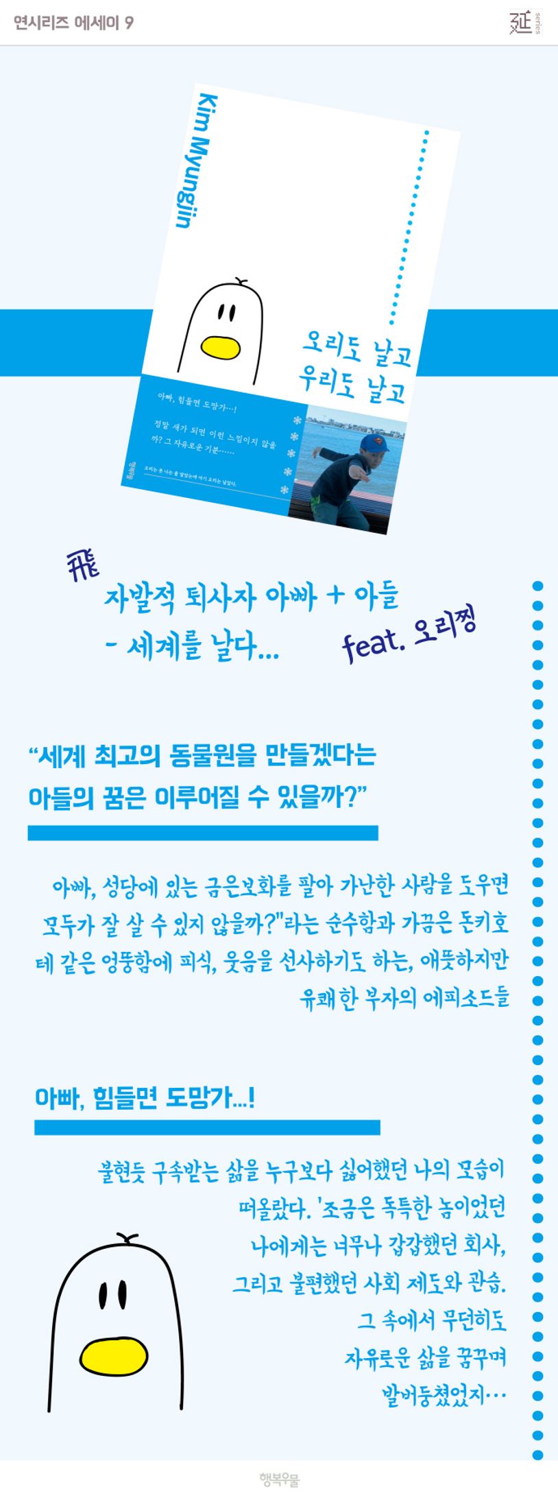 이 책에는 아빠와 아이가 세계를 돌며 겪은, 어려운 여정 속에서도 따뜻한 시선으로 담아낸 순수한 세계가 있다. 세계 어딘가에서 '분노의 질주'를 경험하고 동물들과의 무섭지만 즐거운 우여곡절을 겪으며 지나온 날들. "아빠, 성당에 있는 금은보화를 팔아 가난한 사람을 도우면 모두가 잘 살 수 있지 않을까?”라는 순수함과 가끔은 돈키호테 같은 엉뚱함에 피식, 웃음을 선사하기도 하는, 애뜻하지만 유쾌한 부자의 에피소드들은 여행이 멈춘 시대에 여행을 꿈꾸는 이들에게 오래도록 간직하고 싶은 선물이 될 것이다.