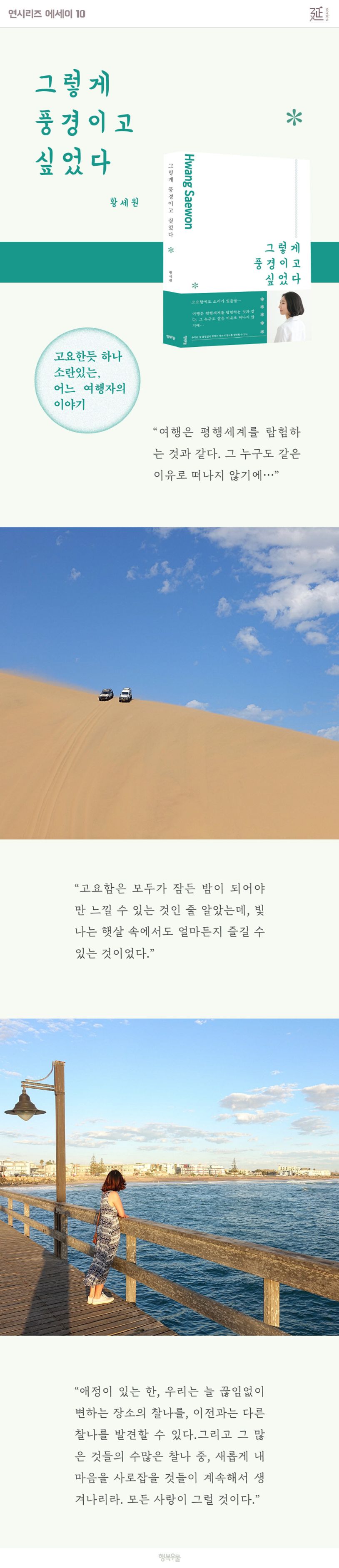 그녀의 말대로 '여행은 평행세계를 탐험하는 것'과 같다. 그 누구도 같은 이유로 떠나지 않기에 결코 같은 공간을 방문하지 못한다. 그러나 독자들은 그녀의 글을 통해 그가 수년간 걸어왔던 길을 함께 걸으며 우리 모두가 분명하게 공유하는 무언가를 찾게 될 것이다. 지금까지와는 다른, 긴 여운이 남는 여행 에세이를 원한다면 황세원 작가가 이끄는 '평행세계'와 같은 신비로운 세상을 마주해 보는 것은 어떨까.