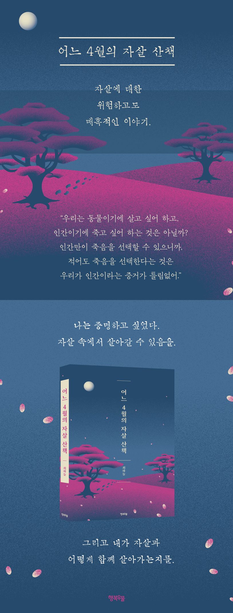 『어느 4월의 자살 산책』은 수차례 자살을 시도한 저자와, 자살로 세상을 떠난 저자의 벗 J의 대화를 교차하며 이어진다. 자살에 다가선 이 둘의 이야기를 번갈아서 따라가다 보면, 독자는 자살이 인간의 권리이자, 인간의 존엄성을 지키기 위한 수단에 불과할 수 있겠다는 생각에 가닿게 된다. 이 과정을 통해 저자는 자살의 권위를 무너뜨리는 데 집중한다. 자살에 대한 관념을 허무는 것. 그것이 이 책의 시작이자 끝이다. 독자는 자살의 관념이 허물어진 폐허 위에서 인간의 존엄성과 자유를 고민하게 될 것이다. ‘자살은 인간이 발명해 낸 가장 위대한 것.’이라고 이야기하는 저자다. 저자와 함께 산책길에 올라 자살에 대한 이런저런 이야기를 나누다 보면, 어느새 자살을 이해하는 새로운 장에 닿을 수 있을 것이다. 이 산책에 초대한다.