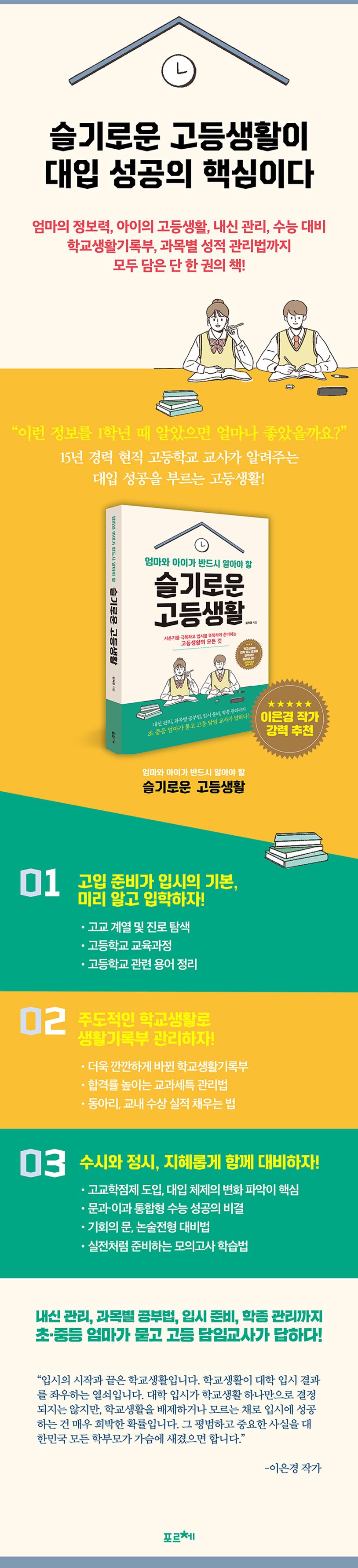 15년 차 베테랑 교사이자 세 아이의 엄마인 저자의 입시 노하우와 학교생활 이야기를 생생하게 담아낸 고등생활 안내서다. “이런 입시 정보를 중학교 때나 고1 때 미리 알았다면 얼마나 좋았을까요?” 하고 속상해하는 고3 학부모들의 목소리를 듣고, 아이들과 학부모들에게 필요한 입시 정보를 쏙쏙 가려 뽑아 알차게 수록했다. 초중고 학부모들이 가장 궁금해하는 내용을 ‘묻고 답하는(Q&A)’ 식으로 구성해, 마치 내 곁에서 입시 상담을 해주듯 친절하게 설명해준다. 공교육 현장에서 쌓은 풍부한 진학 지도 경험을 바탕으로 달라지는 입시제도부터 교육 방향, 진로 탐색에 따른 과목 선택 방법, 정시·수시 입시 전략까지 놓치지 않고 정리했다. 아울러 현장에서 직접 보고 듣는 요즘 학생들의 고민과 심리 케어 방법, 문·이과 통합 후 수업 분위기 등 우리 아이 학교생활이 궁금한 학부모들에게 현직 담임교사가 전해주는 아이들의 교실 풍경은 자녀를 좀 더 이해할 수 있게 해주는 소통의 창구가 되어줄 것이다.