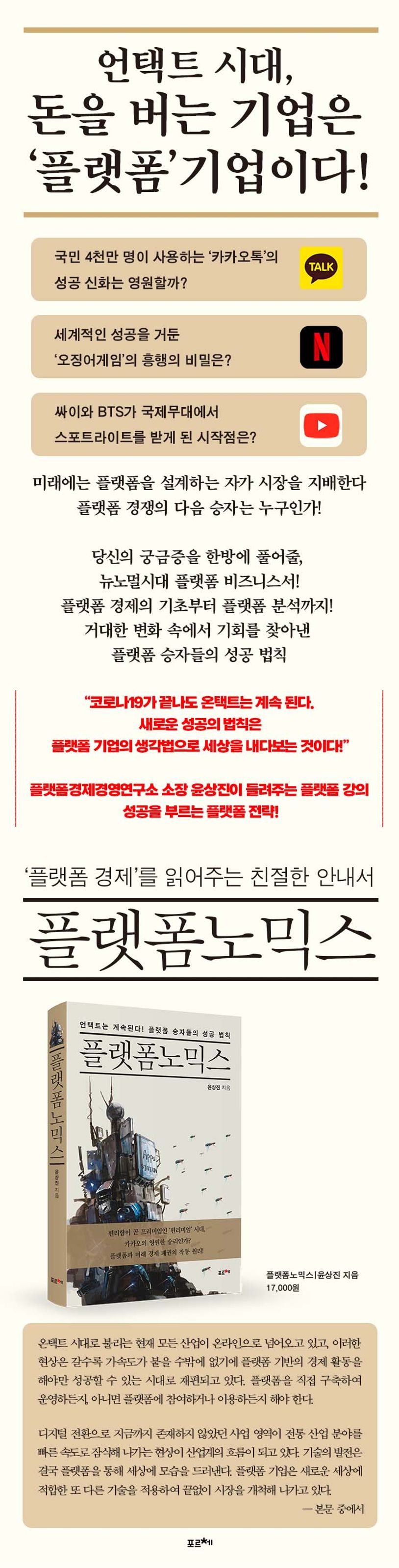 저자는 이미 모든 산업 분야가 플랫폼화되고, 수많은 경제 활동이 플랫폼을 중심으로 일어나고 있음을 강조하고 애플, 구글, 아마존, 페이스북 등과 같은 플랫폼 기업이 세상을 지배하는 이유를 주의 깊게 들여다볼 필요가 있다고 전한다. 세상에는 흐름이 있고, 미래로 나아가고 싶다면 플랫폼에 주목해야 한다. 기업도 개인도 자기만의 채널을 갖게 된 플랫폼 세상에서 이 책은 특히 플랫폼 비즈니스를 시작하는 사업자나 개인을 위한 친절한 플랫폼 비즈니스 가이드가 되어줄 것이다.