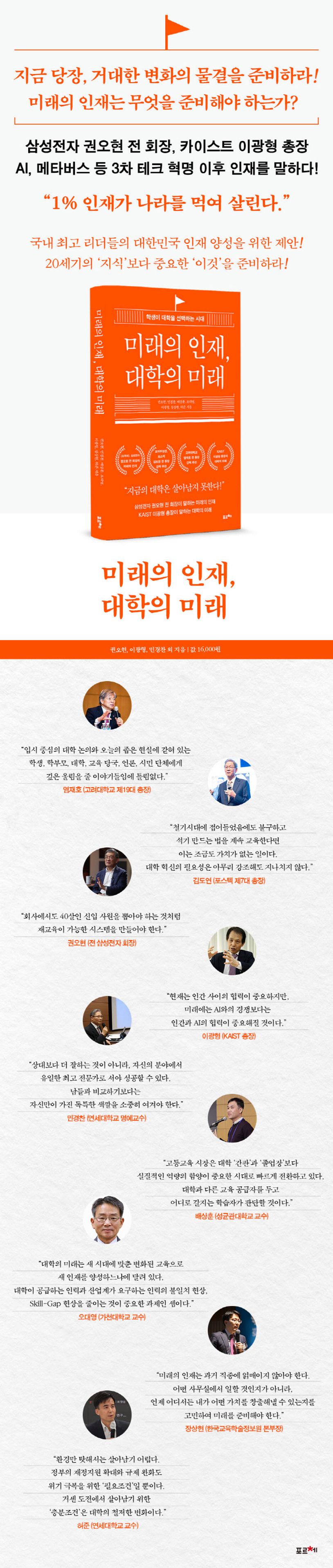 AI, 메타버스, 버추얼 휴먼 그리고 먼 미래 같지만, 곧 맞이할 유전자 편집 기술로 탄생한 인간을 당연하다는 듯 받아들여야 하는 시대가 곧 도래한다. 《미래의 인재, 대학의 미래》는 국내 최고의 지성 7인이 머리를 맞대 새로운 ‘인류’와 공존해야 할 ‘미래의 인재’는 무엇을 준비해야 하는지에 대한 해답을 모색했다. 디지털 시대는 상상할 수 없을 만큼 빠른 속도로 발전하고 있다. 대학생의 85%는 지금 존재하지 않는 직업을 갖고, 벚꽃이 피는 순서대로 대학이 망한다는 우스갯말이 나오는 상황이다. 이 책은 새로운 산업이 등장하고 기존의 가치와 질서가 도전받고 있는 이 시대에 한 사회의 미래를 견인하는 대학은 어떻게 바뀌어야 하는지, 대학에서 길러내는 인재들은 어떤 능력을 준비하여 사회를 이끌어나가야 하는지에 대한 해답을 찾는다. 삼성전자 권오현 전 회장은 급변하는 세계 속에서 인재를 어떻게 키워내야 하는가에 대한 고민과 미래 인재의 조건과 자질을 이야기한다. 카이스트 이광형 총장은 AI가 내재화된 인간과 사회가 공존하며 삶을 의미 있게 개척해나가는 방법을 제안한다. 대학 혁신의 아이콘인 배상훈, 오대영, 장상현, 허준 교수는 AI와 빅 데이터를 기반으로 한 온라인 학습과 공유 대학을 소개하며 학생 맞춤형 교육의 필요성을 강조한다. 민경찬 연세대 명예교수는 정부, 기업, 언론 등 다양한 사회조직이 연결되는 새로운 학습 생태계를 제안한다.