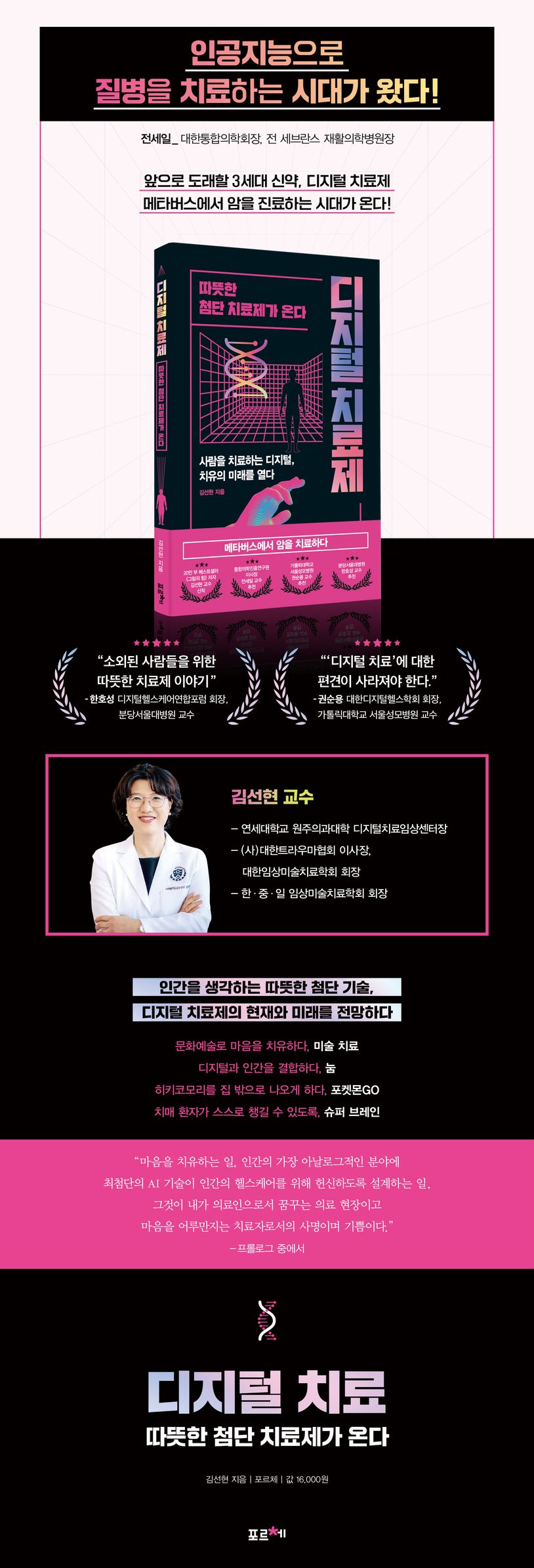 디지털 치료제는 입이 아니라 ‘머리로 먹는 약’이다. 병원에 갈 필요가 없고 스마트폰을 켜면 즉시 나의 상태를 진단하고, 결과를 의사에게 보내 처방받을 수 있다. 처방만 받는다면 ‘디지털’이 아니다. 인공지능과 사람 코치가 함께 다이어트를 도와주는 앱 ‘눔’, 고령자의 인지능력 향상을 보조해 주는 레이싱 게임 ‘뉴로레이서’, ADHD 치료용으로 개발된 게임 EVO 등 인간이 실질적으로 할 수 없는 일을 보조하며 환자의 곁에서 질병 완화를 돕는다. 3세대 신약으로 거듭난 디지털 치료제는 앞으로 다양한 분야에서 활용되며 사람의 손이 닿지 않는 곳까지 세심하게 환자들을 살필 것이다. 또한, 이전 기술과 비교해 좋은 예후 또한 기대할 수 있기에 주목할 필요가 있다. 안타깝게도 우리나라는 아직 공식적으로 인정받은 디지털 치료제가 거의 없다. 이 책의 저자이자 연세대 원주의과대학 디지털치료임상센터장인 김선현 교수는 이 책을 통해 환자들의 여러 상황과 상태를 분석하고 그에 맞는 디지털 솔루션을 제공하는 디지털 치료제의 필요성을 제시한다.