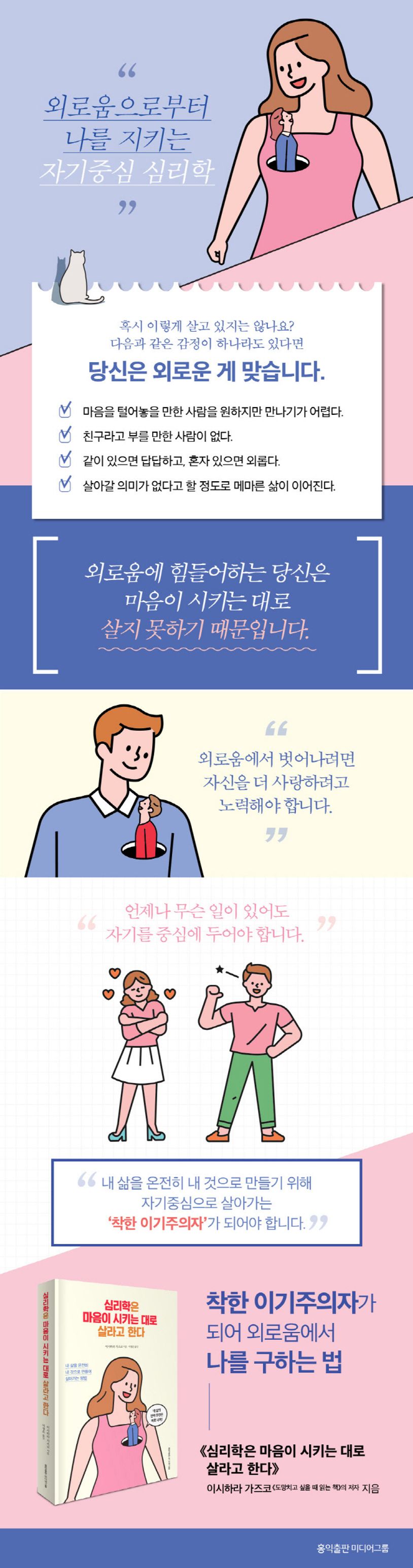이 넓은 세상에 나 혼자뿐이라는 기분을 가진 채 건강하게 살아갈 수 있는 사람은 없다. 어떻게 하면 외로움에서 벗어날 수 있을까? 외롭다는 감정에서 도망치기보다는 내 마음이 무슨 말을 하는지 귀 기울여 들으며 자기를 더 사랑하려고 노력해야 한다. 그런 삶의 방식을 저자는 ‘착한 이기주의’라고 명명한다.