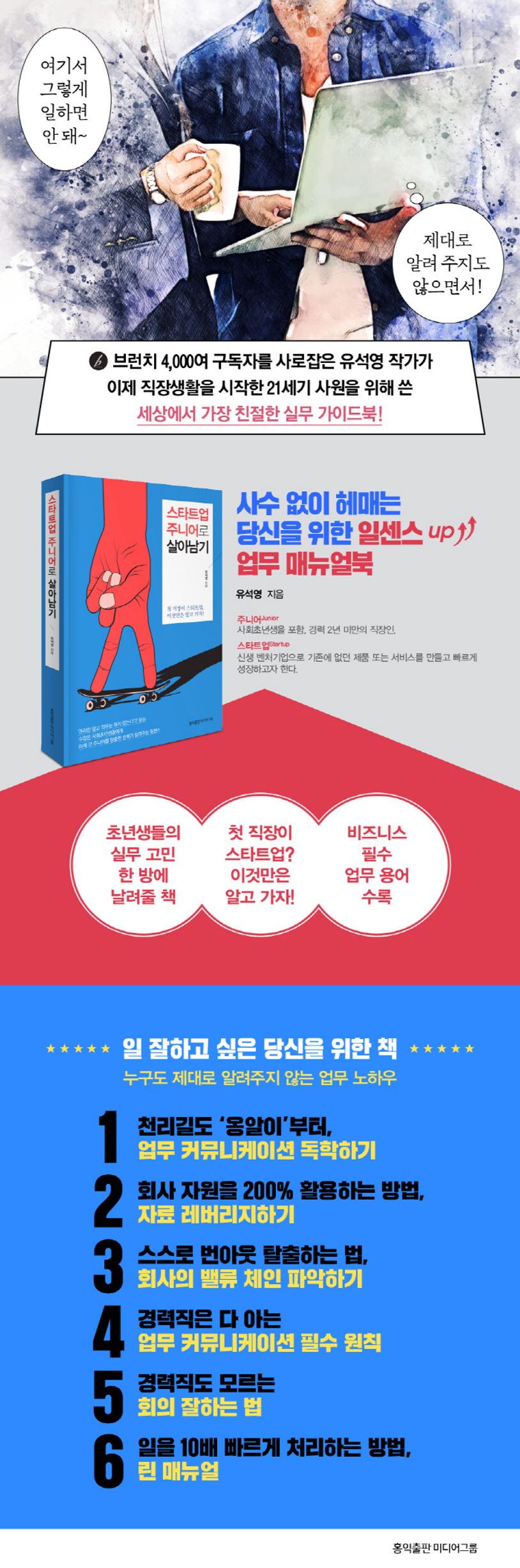 교육 스타트업에서 직장 생활을 처음 시작, 지금까지 1,500명 이상의 창업가나 주니어들을 만나 온 저자는 자신이 사회초년생 때 겪었던 시행착오를 다른 이들은 겪지 않기를 바라는 마음으로 이 책을 썼다. 신입사원에게 꼭 필요한 실무 노하우와 매뉴얼의 핵심만을 풀어내 비즈니스 현장에서 유용하게 써먹을 수 있다.