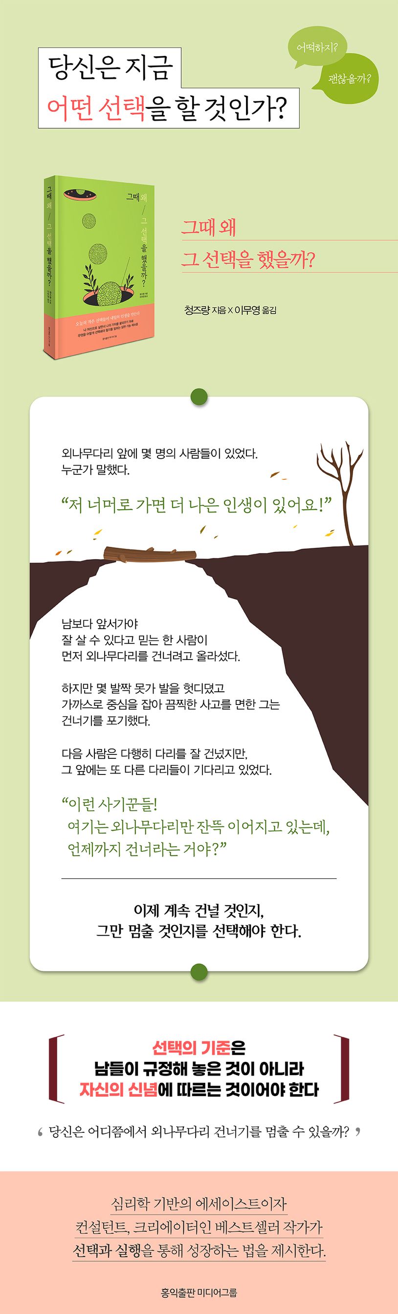 선택지가 너무 많아진 오늘날, 사람들은 쉽게 선택을 하지 못하는 일명 ‘선택 장애’를 호소한다. 심지어는 남에게 선택을 맡기거나 다음으로 미루며 그 순간을 회피하기도 한다. 선택 뒤의 대가는 온전히 자신의 몫이 되기 때문이다.