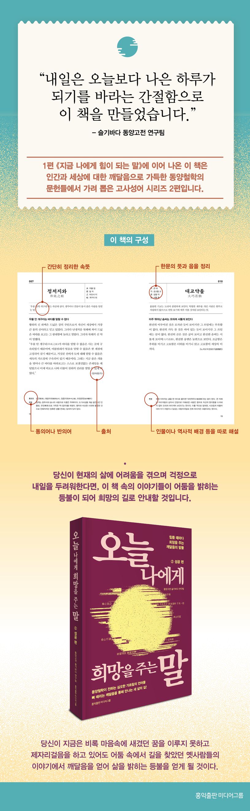 이 책은 독자들의 사랑을 받은 《오늘 나에게 힘이 되는 말/①도전편》의 후속편으로 고대중국의 혼란기를 살아냈던 사람들의 삶의 현장에서 걷어 올린 생생한 일화들을 통해 미래로 달려 나가는 우리에게 희망과 힘을 주는 이야기들을 모았다. 독자 여러분은 동양철학의 진수를 담은 고사성어들과 해설을 읽으며 더 나은 내일을 위해 오늘 무엇을 해야 할지 깨닫게 될 것이다.동양고전 속의 깨알 같은 글자들에서 우리는 시행착오와 좌절로 얼룩진 삶을 이겨내고 끝내 승리자가 될 수 있을 것이다. 왜냐하면 이 책에는 옛날 우리와 똑같은 인생길을 걸어갔던 사람들의 온갖 경험과 거기서 얻은 자각이 고스란히 담겨 있기 때문이다. 그런 의미에서 이 책은 독자 여러분에게 수십 권의 인문서나 자기계발서와 맞먹는 깨달음의 무게로 다가갈 것이다.