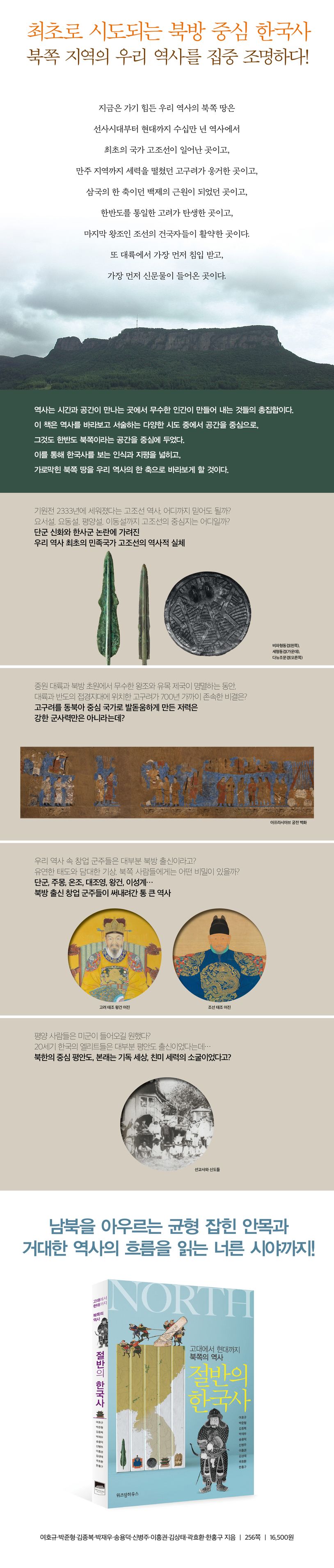한반도의 북쪽 지역은 우리나라 최초의 나라인 고조선이 들어선 곳이자 가장 광대한 영토를 경영한 고구려와 발해의 발판이 된 곳이며, 고려와 조선이 외세의 침입을 막고 무역을 하던 역사의 현장이었다. 이 책은 고대부터 현대까지 한반도 북쪽은 물론 그 너머 만주에서 펼쳐졌던 ‘절반의 한국사’에 다시금 숨을 불어 넣어 한국사를 보는 인식과 지평을 넓히고, 가로막힌 북쪽 땅을 우리 역사의 한 축으로 바라보게 할 것이다.