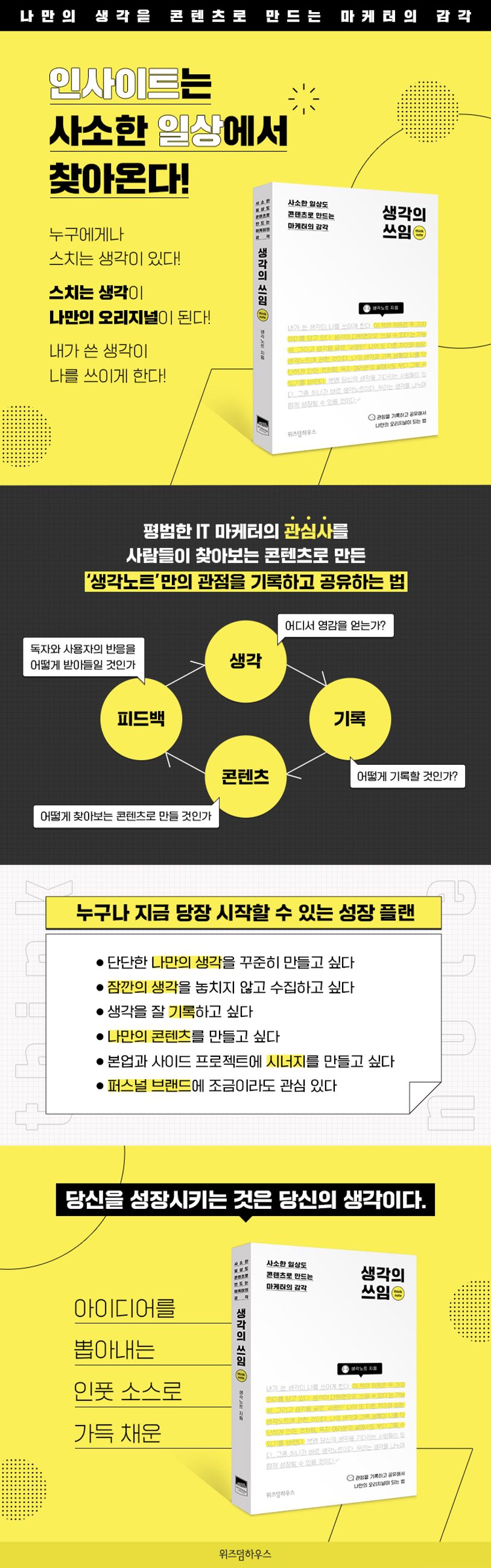 개인적인 여행을 기록해 퍼블리(PUBLY) 펀딩 1,200%를 달성, 《도쿄의 디테일》 《교토의 디테일》을 출간한 저자 ‘생각노트’가 사소한 일상을 콘텐츠로 만들어내는 방법을 공개한다. 생각노트는 한 번의 퍼블리 펀딩과 두 권의 책을 내는 동안에도 본캐(본래의 캐릭터, 여기서는 ‘생각노트’의 실명과 신상울 의미)를 공개하지 않았지만 ‘요즘 뜨는 브랜드’에서 이직 제안을 받곤 한다. 생각노트 본캐의 얼굴도 나이도 이력도 모르는 회사들이 생각노트에게 자리를 제안하는 이유는 생각노트의 콘텐츠가 얼굴과 나이보다 선명한 오리지널리티이고, 두꺼운 이력서보다 강력한 한 줄짜리 포트폴리오이기 때문이다. 이렇게 우리는 생각을 기록하고 공유해 읽히는 콘텐츠로 만들면 삶의 새로운 가능성이 열리는 시대에 살고 있다. 누구에게나 스치는 생각들이 있다. 그것을 콘텐츠로 바꾸는 것은 아주 작은 차이이다. 사소한 일상과 관점을 기록하고 공유해서 나만의 오리지널 콘텐츠로 만드는 방법이 궁금하다면, 생각노트의 여정 《생각의 쓰임》에 함께해보자.