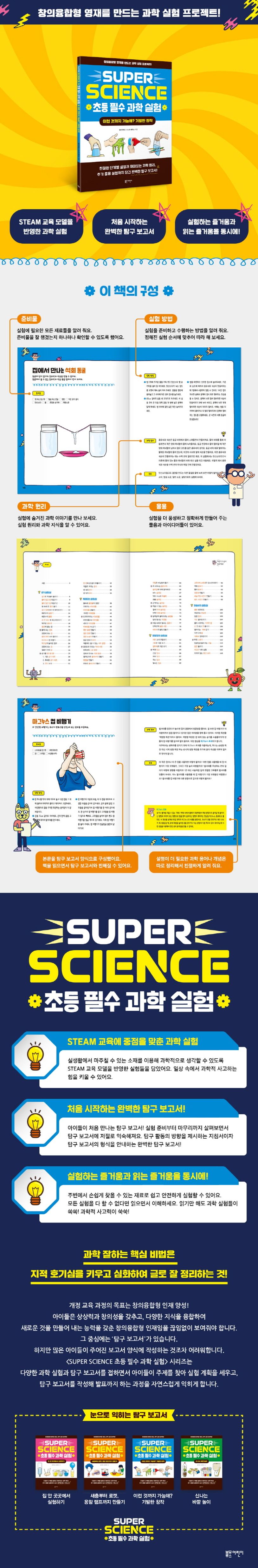 최근 교육 현장에서는 창의융합형 인재를 양성하기 위한 융합인재 교육, 즉 STEAM 교육이 수업 모델로 제시되고 있습니다. STEAM 교육은 과학, 기술, 공학, 예술, 수학을 통합해 융합적 사고력과 실생활 문제 해결력을 키우는 것을 목표로 하는 교육입니다. 이 책은 STEAM 교육에 맞는 초등 필수 과학 실험들을 모았습니다. 아이가 책 속 어떤 실험을 고르더라도 다양한 영역으로 지식과 호기심을 확장해 줄 거예요. 책에 실린 실험들을 다 못 해도 괜찮습니다. 실험들을 탐구 보고서 형식으로 구성했기 때문에 직접 해 보지 못한 실험은 읽으면서 쉽게 이해할 수 있답니다. 단계별 설명과 이해를 돕는 그림, 실험에 숨은 과학 원리와 추가 응용 실험까지 빠짐없이 담았습니다. 아이들에게는 이 책이 처음 만나는 탐구 보고서가 되겠지요? 실험 준비부터 마무리까지 찬찬히 살펴보면 자연스럽게 탐구 보고서에 익숙해질 것입니다. 〈SUPER SCIENCE 초등 필수 과학 실험〉에서 소개하는 틀에 박히지 않은 다양한 실험을 만나 보세요. 아이들의 논리력과 사고력은 물론 독창성과 창의성이 자라게 하는 데 큰 도움이 될 것입니다.