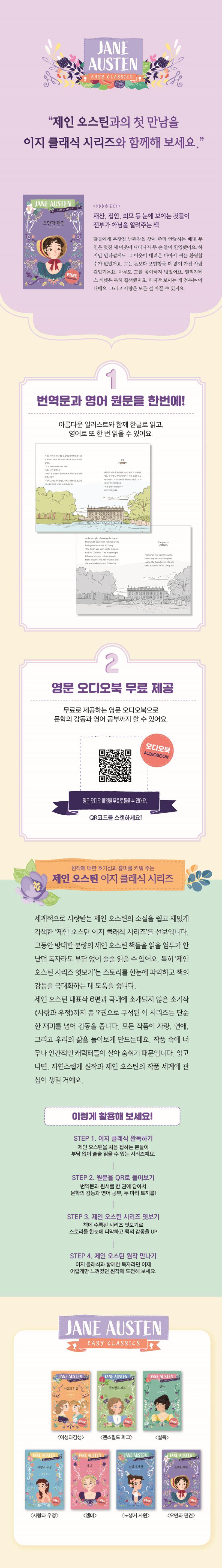 이 책은 단순히 읽는 데서 끝나지 않아요. 명작으로 영어 공부까지 하는 실용적인 책입니다. 무료로 제공하는 영문 오디오북으로 문학의 감동과 영어 공부, 두 마리 토끼를 잡아보세요. 영문 오디오북 속도에 맞추어 영어 원문을 따라 읽거나 한글로 이해한 내용을 영문 오디오북으로 듣다 보면 영어와 금방 친해질 수 있습니다. 제인 오스틴과의 첫 만남을 〈제인 오스틴 이지 클래식〉과 함께해 보세요.