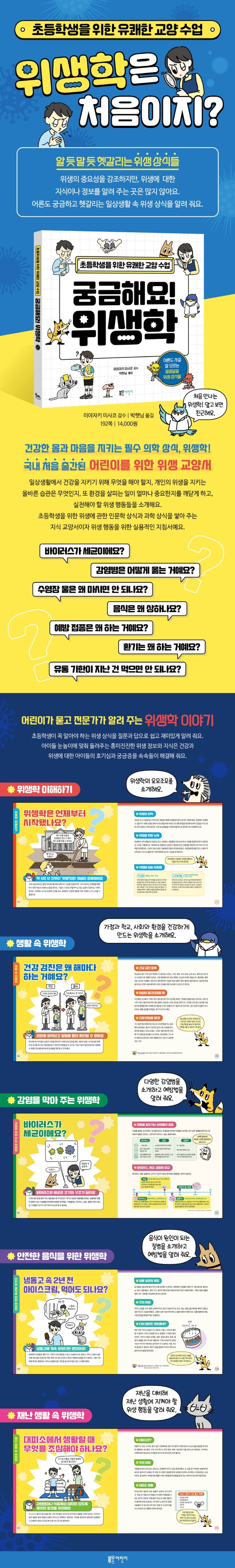 《궁금해요! 위생학》은 초등학생이 꼭 알아야 할 위생 상식의 모든 것을 알려 줍니다. 아이들에게는 ‘위생’이란 단어가 낯설지도 모릅니다. 하지만 일상생활에서 하는 행동에는 이미 위생의 의미가 들어 있는 경우가 많습니다. 집에 들어오거나 밥을 먹기 전에 손을 씻는 것, 환기를 하고 청소를 하는 것도 위생 행동입니다. 전 세계 규모의 감염병이 유행하고, 지구 온난화로 인해 질병도 많이 늘었습니다. 이제껏 겪어 본 적 없는 규모의 홍수나 태풍도 끊이지 않습니다. 또 알게 모르게 몸에 나쁜 영향을 미치는 음식을 먹을 때도 있습니다. 우리를 둘러싼 환경이 건강을 위협합니다. 위생이 더 중요해지는 이유입니다. 《궁금해요! 위생학》은 위생과 관련된 인문, 과학 지식을 바탕으로 일상생활에서 나와 가족, 이웃의 건강을 지키기 위해 꼭 알아 두고 실천해야 하는 위생 상식과 위생 행동을 소개합니다. 이 책이 여러분에게 위생학을 더 알고 싶어지는 계기가 되고, 건강을 지키는 데 도움이 되면 좋겠습니다.