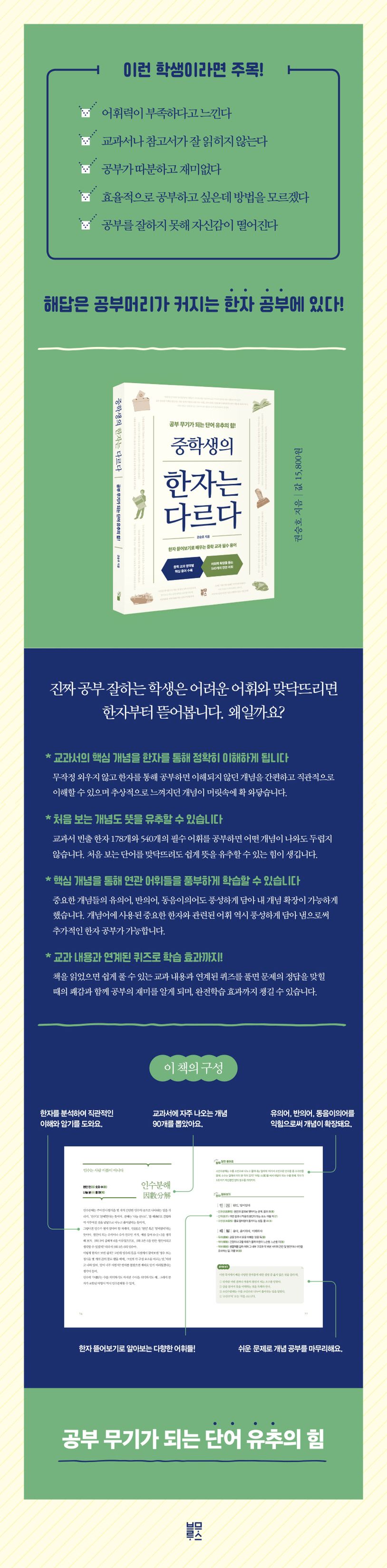 하루 10분만 투자하여 한 꼭지씩 읽어 나가면 어느새 머릿속에 교과서 빈출 한자 178개와 540개의 필수 어휘가 머리에 박힙니다. 이것들만 머릿속에 든든히 갖고 있으면, 어떤 개념이 나와도 두렵지 않습니다. 처음 보는 단어를 맞닥뜨려도 쉽게 뜻을 유추할 수 있으니까요. 한자를 알면 공부의 진입장벽은 낮아지고 시험에서 자신감이 솟아납니다. 이 책을 통해 익힌 한자 꾸러미는 중학교뿐만 아니라 고등학교에 올라가서 더욱 큰 힘이 될 것입니다.