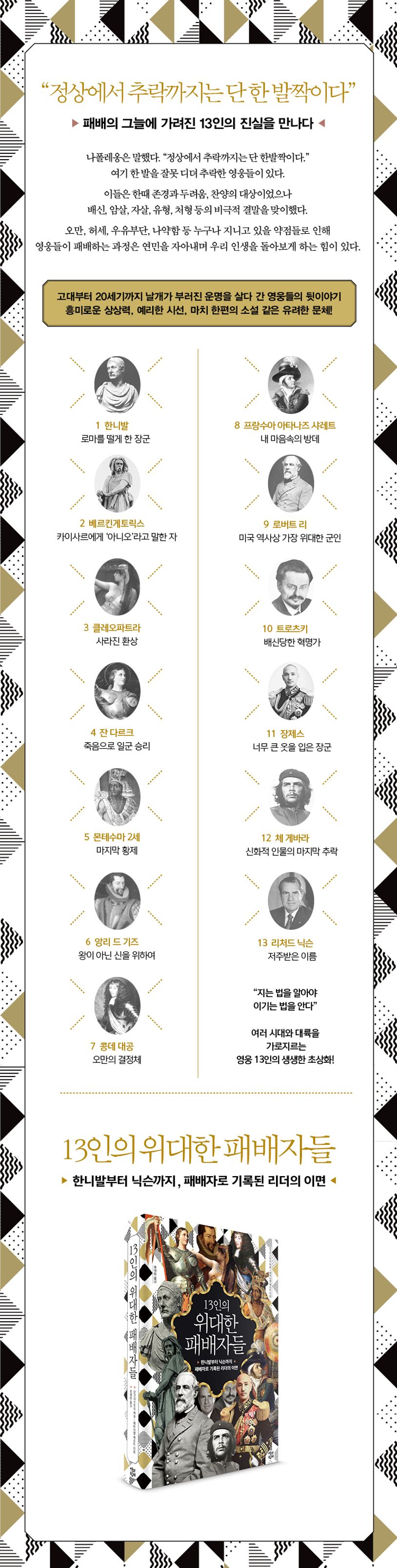 역사는승자의기록이다.대결의승패에따라승자는선한인물이되고,그의업적은대대로칭송받게된다.우리는이런역사의기록을보며승자를아름답고위대한인물로기억하곤한다.하지만때로는승자보다위대한패배자가더뚜렷이기억되고,후대에교훈과영감을주는경우가종종있다.이책에나오는13인이바로그러한경우다.