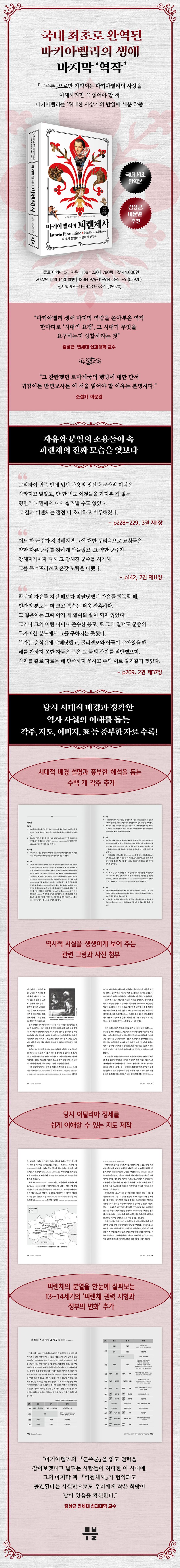 정치학과 처세술에 관한 대표작 『군주론』 덕분에, 마키아벨리는 흔히 목적 달성을 위해서는 수단과 방법을 가리지 않는 비정한 냉혈한의 이미지로 알려져 있다. 그러나 그의 사상을 깊이 있게 이해하고 싶다면 이미 잘 알려진 『군주론』, 『로마사 논고』 등을 넘어 그가 생애 마지막으로 쓴 『피렌체사』를 꼭 읽어봐야 한다. 『피렌체사』는 13~15세기의 피렌체와 주변 이탈리아를 중심으로 유럽 중세 정치, 역사를 총망라한 책으로, 마키아벨리가 죽기 꼭 1년 전인 1526년 교황 클레멘스 7세에게 헌정되었다. 피렌체의 역사는 물론, 이탈리아 반도와 주변국의 정세, 사건을 폭넓게 서술한 『피렌체사』는 그를 ‘위대한 사상가의 반열에 세운 역작’이라는 평가를 받는다. ‘세상에서 가장 위험한 현자’라고도 불리는 마키아벨리는 자신이 태어나고, 활발히 활동하다 죽은 피렌체에 대해 과연 어떤 이야기를 썼을까. 그가 이 책을 쓸 당시 피렌체는 메디치 가문에 의해 통치되고 있었다. 공직에서 쫓겨나 생계유지에 어려움을 겪던 마키아벨리는 메디치 가문의 수장이자 교황인 클레멘스 7세의 요청에 의해 『피렌체사』를 집필하게 된다. 마키아벨리의 입장에서는 교황과 메디치 가문의 눈치를 보지 않을 수 없었을 것이다. 하지만 그는 이 책에서 냉철하고 신중한 통찰력을 발휘하는 것은 물론, 때로는 간접적인 비판 등을 통해 재치 있게 정확한 사실을 기술하기 위해 노력했다.