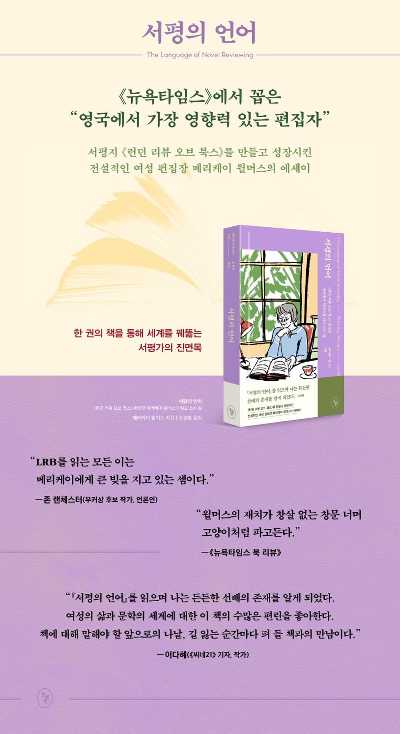 영국 문화계의 독보적인 여성 편집자 메리케이 윌머스의 에세이와 서평을 한데 엮은 산문집『서평의 언어』(원제: Human Relations and Other Difficulties)가 출간되었다. 반세기 가까이 현장에서 활약해온 베테랑 편집자이자 전방위적 저널리스트로서 쌓아온 통찰이 유감없이 녹아 있는 에세이로, 우아한 문장과 때로는 짓궂은 유머의 조화가 절묘하다. 이 책을 통해 한국 독자들과 처음 만나는 그는 국내에서도 큰 사랑을 받은 올리버 색스의 『아내를 모자로 착각한 남자』(원제: The Man Who Mistook His Wife for a Hat)의 제목을 지은 장본인으로도 알려져 있다(책의 서문에서 색스는 윌머스에게 특별한 감사의 말을 전하기도 했다). 윌머스는 이 책에서 문학 편집자로서 진 리스, 조앤 디디온 등 여성 작가의 작품을 예리하게 살피고, 남다른 식견으로 안목 있는 독자들의 눈길을 사로잡는다. 그 자신이 여성 직업인으로서 느낀 일과 삶에 대한 고민은 오늘을 살아가는 한국 여성들에게 공감을 불러일으키는 바가 있다. 격조 있는 인문 에세이를 기다려온 독자들에게 지적인 충만감을 선사하는 책이다.
