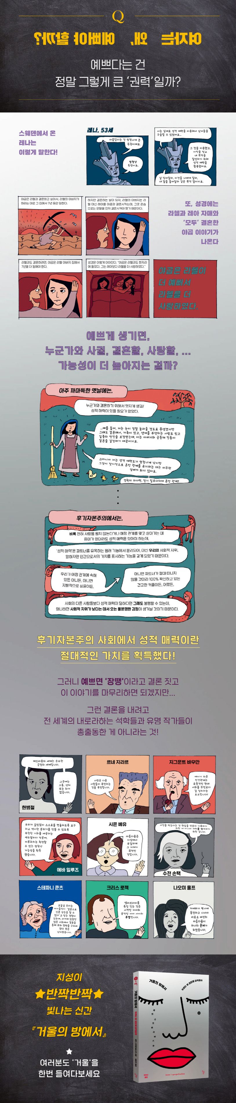 스웨덴의 페미니즘 예술가 리브 스트룀크비스트의 그래픽노블이 돌베개 그래픽노블&논픽션 시리즈 ‘만화경’으로 출간되었다. 전작 『이브 프로젝트: 페미니스트를 위한 여성 성기의 역사』(푸른지식, 2018)로 여성 성기를 터부시하는 문화를 유머러스한 태도로 비판했던 그가 이번에는 외모와 아름다움에 삶의 방향이 좌우되었던 현실(또 텍스트) 속 여성들을 소환하여 인류가 외모(특히 여성의 아름다움)에 집착해 온 역사를 따라가본다. 구약시대 레아와 라헬 자매, 21세기의 SNS 인플루언서 카일리 제너, 그리고 옛 이야기에 등장하는 백설공주의 어머니, 영원한 섹시의 아이콘 매릴린 먼로, 미모로 소문났던 오스트리아-헝가리 제국 황후 ‘시시’가 주인공이다. 시몬 베유, 지그문트 바우만, 한병철, 에바 일루즈, 르네 지라르, 수전 손택, 나오미 울프, 크리스 로젝, 리처드 시모어, 마틴 헤글룬드, 스테파니 쿤츠, 크리스토퍼 래시 등이 등장해 시공을 초월한 여행의 길잡이가 되어준다.