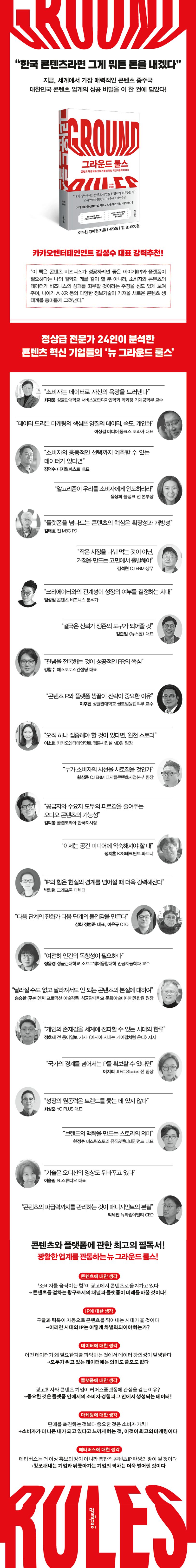 유튜브와 틱톡 등 개인 디지털 콘텐츠는 TVㆍ영화ㆍ음악을 필두로 한 레거시 콘텐츠를 어떻게 변화시킬까? 게임·XR(실감형미디어)·메타버스는 어떤 모습으로 발전하게 될까? 무엇보다 인간의 창의과 상상에 기대어 발전해온 콘텐츠 산업은 어떻게 데이터와 만나 폭발적 성과를 일구는가? 세계에서 가장 매력적인 콘텐츠를 만드는 전문가 24인의 대담과 인사이트! 대한민국 콘텐츠 업계를 한눈에 조망할 수 있는 단 한 권의 도서!