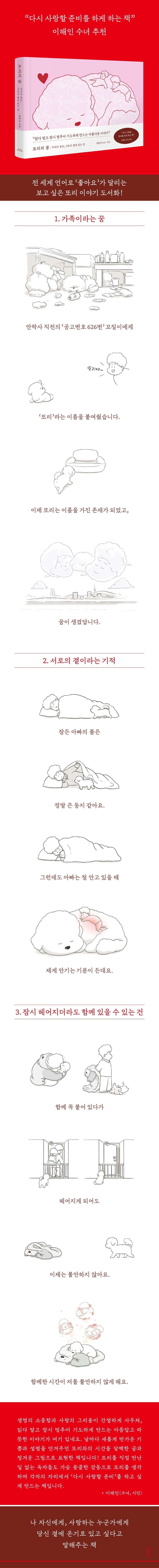 “공고번호626번유기견을입양해오는순간,구원받은것은강아지또리가아니라인생의어둠을지나고있던우리부부였다”또리와함께한2년,서로의슬픈과거를‘함께있음’이라는온기로데운그림에세이잠든아빠의품은정말큰둥지같아요.그런데도아빠는절안고있을때제게안기는기분이든대요.(본문61~63쪽)게시물하나를올릴때마다적게는2~3만개에서많게는30만개에이르는‘좋아요’가달리는원동민작가(onec)의인스타그램에는우리말뿐아니라영어,일본어,스페인어등전세계여러언어의댓글이이어진다.흥미로운점은그의이야기가대한민국서울이라는특정한장소에구애받지않고,몇컷의그림만으로도자연스럽게이해되고받아들여진다는사실이다.또리와의일상이국경을넘어손상없이읽히는이유는무엇일까.아마도가족이라는존재,즉힘들때나어려울때나어떤조건이나요구없이곁을데워주는다정한존재에대한감각이세계곳곳에서공통으로공유되고있기때문일것이다.『또리의꿈』은광고영상디자이너이자그림에세이『어른이라는거짓말』을출간한일러스트레이터원동민작가가유기견또리를입양한뒤,가족으로서함께한시간을엮어낸그림에세이다.원동민작가는우연히유기견입양사이트에서꼬질꼬질한모습의‘또리’를발견한뒤,아이의얼굴이오래마음에남아결국입양을결심하게된다.처음에는안락사를앞둔아이를‘구조’했다고생각했지만,또리와함께사계절을지나며단조롭던일상에서구원받은쪽은오히려자신이었다는사실을깨닫게된다.또리를만난이후그의삶은마치수많은색을흩뿌린듯눈에띄게다채로워진다.『또리의꿈』은반려견그림에세이라는형식을빌려,누군가의곁이되어주는일이한사람의삶을어떻게바꾸는지를보여준다.책은함께한시간의결을잔잔하게따라가며,가족이라는말이지닌가장단순하고도깊은의미를다시떠올리게한다.『또리의꿈』은반려견을키운경험을넘어,‘서로의곁’이었던존재를기억하며살아가는모든이에게진한감동을선사할것이다.이해인수녀추천“다시누군가를사랑할준비를하게하는책”사랑한다는말대신건네고싶은책함께꼭붙어있다가헤어지게되어도이제는불안하지않아요.함께한시간이저를불안하지않게해요(본문88~95쪽)『또리의꿈』은반려견과함께한시간을통해,사랑이남기는흔적을조용히보여주는그림에세이다.이책은잠시헤어져있더라도함께한시간이남긴충만함이서로의부재를견디게해줄수있다고담담하게전한다.슬픔을극복하라고말하지도,상실을서둘러정리하라고요구하지도않는다.대신함께있었던시간이우리를어떻게단단하게만드는지,그기억이이후의삶을어떻게강하게지탱하는지를담백한글과따뜻한그림으로전한다.이책의가장큰장점은단몇컷의장면만으로말로는전하기어려운감정의결을건드린다는데있다.『또리의꿈』은반려견을키운경험이없는독자에게도자연스럽게읽힌다.이책이다루는것은반려견이라는특정한소재를넘어,누구에게나한번쯤있었던‘곁이었던존재’의기억이기때문이다.특히책이출간된겨울이라는계절은,마음이쉽게움츠러드는시간이기도하다.『또리의꿈』은그런계절에말대신해곁에놓일수있는온기가된다.사랑한다는말보다,아무말없이건네는이책한권이더깊은사랑의고백이될수있다.이해인수녀는이책을두고“다시누군가를사랑할준비를하게하는책”이라고추천했다.그말처럼,『또리의꿈』은다시누군가를곁에들일수있는마음을조심스럽게열어주는책이다.사랑한다는말보다더강력한고백이되는선물일것이다.추천사이해인(수녀,시인)생명의소중함과사랑의그리움이간절하게사무쳐,읽다말고잠시멈추어기도하게만드는아름답고따뜻한이야기가여기있네요.날마다새롭게반가운기쁨과설렘을안겨주던또리와의시간을담백한글과정겨운그림으로표현한책입니다!또리를직접만난일없는독자들도가슴뭉클한감동으로또리를생각하며각자의자리에서‘다시사랑할준비’를하고싶게만드는책입니다.