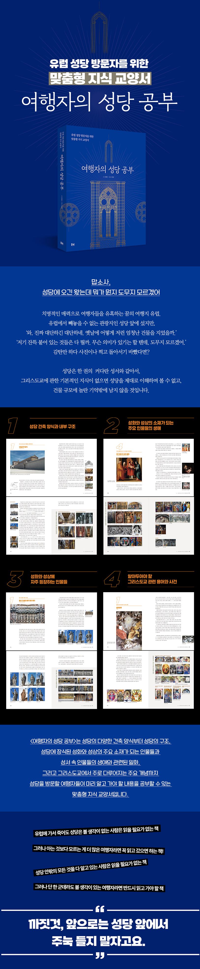 이 책은 유럽에 가서 한 군데라도 성당을 들를 생각이 있는 여행자를 위한 안내서이자, 미리 알고 가야 할 내용을 공부할 수 있는 맞춤형 지식 교양서입니다. ‘커다란 한 권의 성서’라고 불리는 성당은 그리스도교에 대한 기본 지식을 알지 못하면 그저 건물 규모에 놀란 기억으로밖에 남지 못할 것입니다. 이 책과 함께라면 성당 투어에 관한 한, 아는 만큼 보이는 여행의 즐거움을 만끽할 수 있을 것입니다.