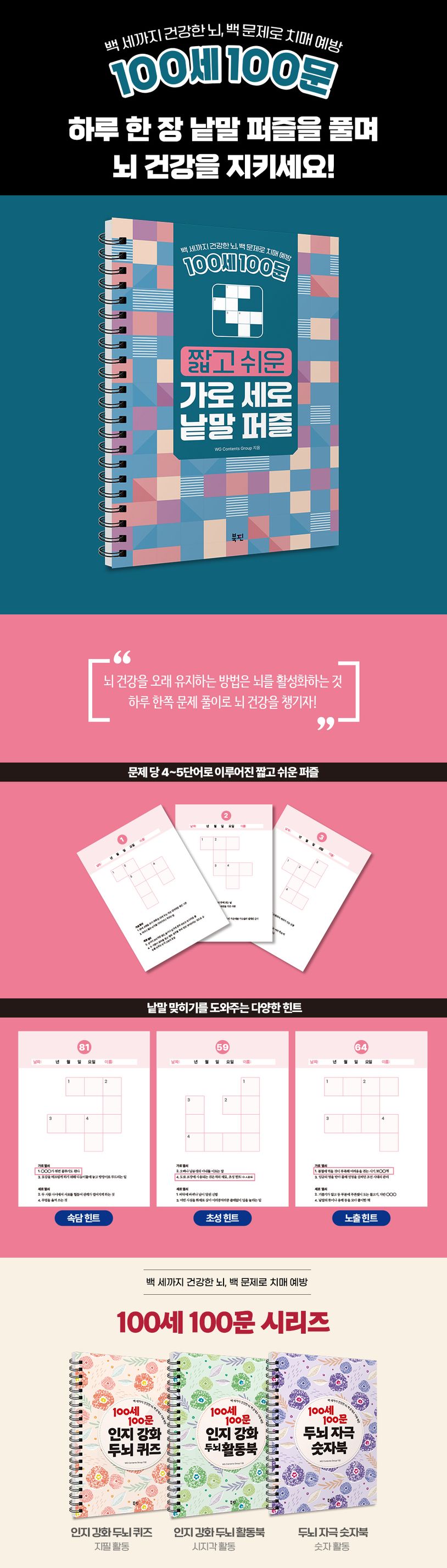 어르신 세대에 익숙한 퍼즐인 가로 세로 낱말 퍼즐을 풀면서 뇌 건강을 지키고 언어 인지 능력을 강화할 수 있는 100문제로 구성한 퍼즐 책이다. 문제 당 4~5개의 짧고 쉬운 단어로 구성되어 있어 긴 시간 집중력을 요구하지 않아 피로감은 줄이고 성취감을 높일 수 있다. 시니어의 눈높이에 맞는 단어들을 선별하였으며, 큰 글씨와 넓은 빈칸, 단어를 떠올리게 도와주는 힌트 등을 제공한다.