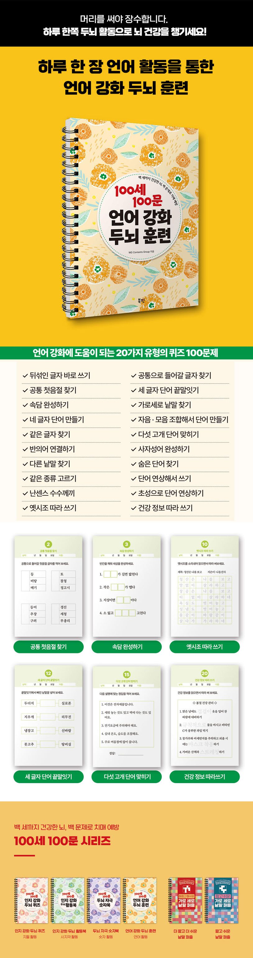 노화로 인해 능력이 저하되는 여러 인지 영역 중에서 삶에 가장 큰 영향을 미치는 언어 인지 능력을 강화하는 것에 중점을 둔 책이다. 단어를 떠올리는 것에서부터 문장을 소리내어 말하고 수수께끼를 풀고 옛시조와 건강 정보를 따라 써 보는 등 다양한 유형의 언어 활동으로 100문제를 구성하였다. 시니어의 눈높이에 맞는 어휘를 선별하였으며, 읽기 쉽게 큰 글씨 편집과 편하게 문제를 풀 수 있는 스프링 제본으로 만들어졌다.
