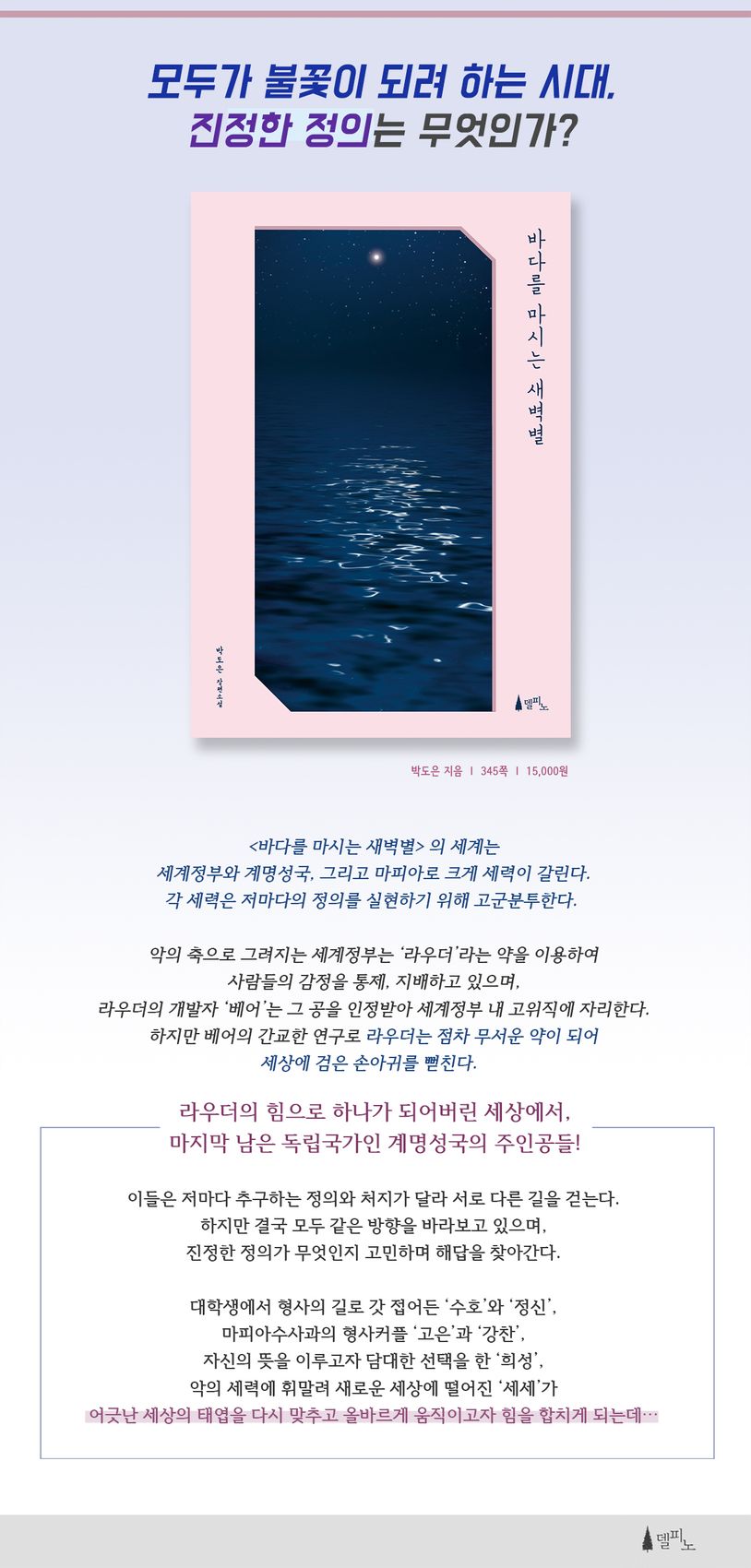 〈바다를 마시는 새벽별〉 의 세계는 세계정부와 계명성국, 그리고 마피아로 크게 세력이 갈린다. 그리고 각 세력은 세상이라는 무대 아래에서 저마다의 정의를 실현하기 위해 고군분투한다.